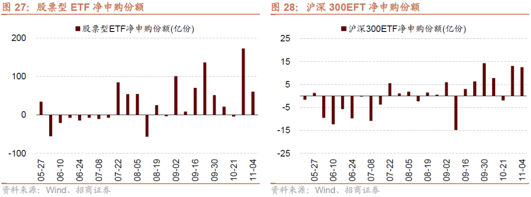 10月31日-11月4日,ETF净申购,当周净申购60.5亿份,宽指ETF以净申购为主,其中沪深300ETF申购较多;行业ETF申赎参半,其中医药ETF申购较多,消费ETF赎回较多。具体的,沪深300ETF净申购12.5亿份;创业板ETF净申购5.0亿份;中证500ETF净申购6.5亿份;上证50ETF净赎回11.7亿份。双创50ETF净申购0.4亿份。行业方面,信息技术ETF净申购5.7亿份;消费ETF净赎回14.8亿份;医药ETF净申购21.1亿份;券商ETF净赎回2.6亿份;金融地产ETF净赎回4.2亿份;军工ETF净申购9.9亿份;原材料ETF净申购0.1亿份;新能源&智能汽车ETF净赎回5.9亿份。