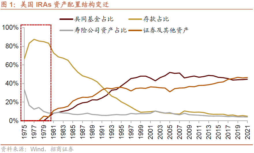 在美国个人养老金成立初期,IRAs主要投向存款,并投有少部分寿险公司产品,而对共同基金和证券配比为0。从1980年开始,IRAs的配置从存款转向证券及共同基金,1980年IRAs对共同基金和证券的配比均达到4.17%;5年之后的1985年,IRAs对基金和证券的配比则分别达到13.69%和21.16%,如果按照其中60%投向股票市场,则IRAs直接和间接持有股票资产的比例为20.91%,彼时美国个人养老金成立约10年。