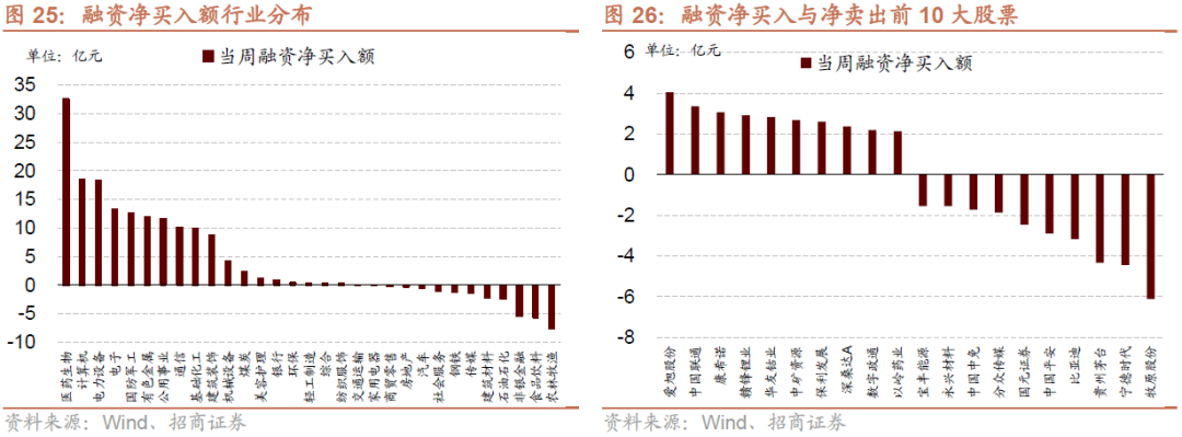 10月31日-11月4日,融资资金净流入119.2亿元。具体来看,本周融资资金买入医药生物(+32.5亿元)、计算机(+18.5亿元)、电力设备(+18.3亿元)等行业,净卖出农林牧渔(-7.7亿元)、食品饮料(-5.7亿元)、非银金融(-5.5亿元)等行业。个股方面,融资净买入规模较高的为爱旭股份(+4.0亿元)、中国联通(+3.4亿元)、康希诺(+3.1亿元)等;融资净卖出规模较高的包括牧原股份(-6.1亿元)、宁德时代(-4.4亿元)、贵州茅台(-4.3亿元)等。