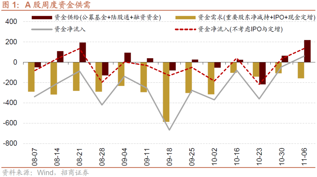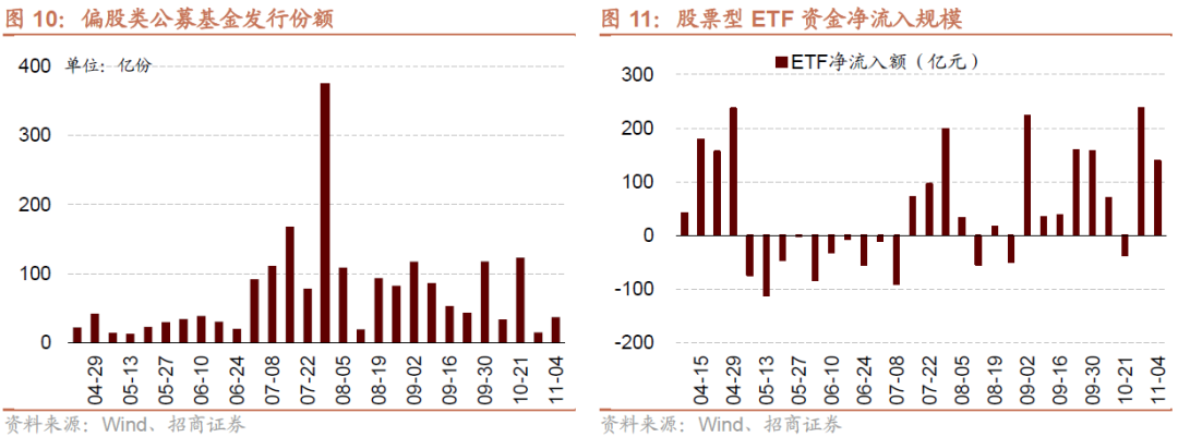 资金供给方面,10月31日-11月4日,新成立偏股类公募基金37.3亿份,较前期增多21.8亿份。股票型ETF较前期净流入,对应净流入139.5亿元。全周整个市场融资净买入119.2亿元,从前期净流出转为净流入,截至11月4日,A股融资余额为14531.4亿元。陆股通本周净流出,当周净流出规模为50.1亿元,净卖出额较前期收窄76.9亿元。