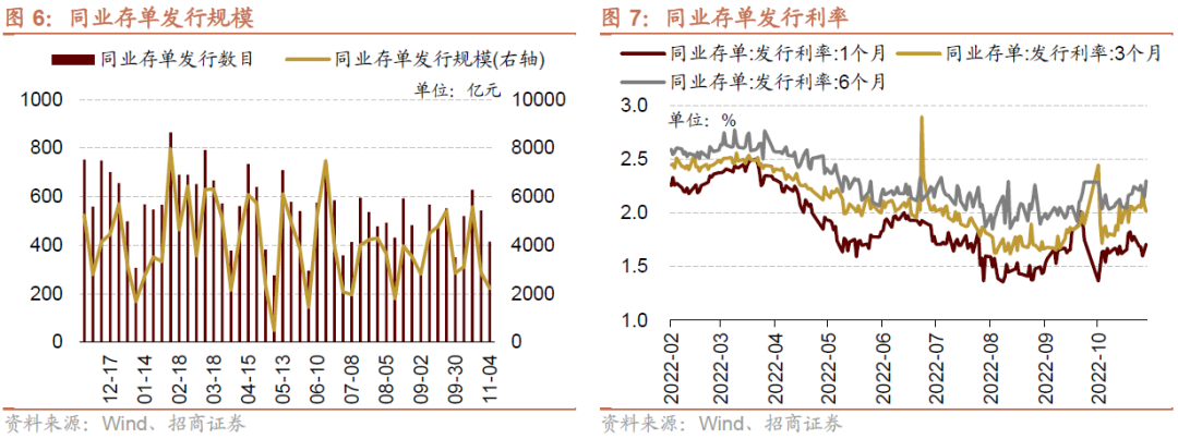 同业存单发行规模下降,发行利率涨跌不一。10月31日-11月4日,同业存单发行415只,较上期减少128只;发行总规模2223.1亿元,较上期减少659.6亿元;截至11月4日,1个月、3个月和6个月发行利率分别较前期变化-7.2bp、-0.8bp、5.5bp至1.71%、2.02%、2.30%。