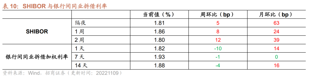 货币市场净回笼7370亿元,隔夜SHIBOR利率较上周上行。截至11月9日,隔夜SHIBOR较上周上行5bp至1.81%,1周SHIBOR较上周上行8bp至1.86%,2周SHIBOR较上周上行12bp至1.80%。截至11月8日,1天银行间同业拆借利率较上周下行10bp至1.82%,7天银行间同业拆借利率较上周下行1bp至1.93%,14天银行间同业拆借利率较上周下行4bp至1.88%。在货币市场方面,上周货币市场投放1180亿元,货币市场回笼8550亿元,货币市场净回笼7370亿元。在汇率方面,截至11月9日,美元兑人民币中间价报7.2189,与上周基本持平。