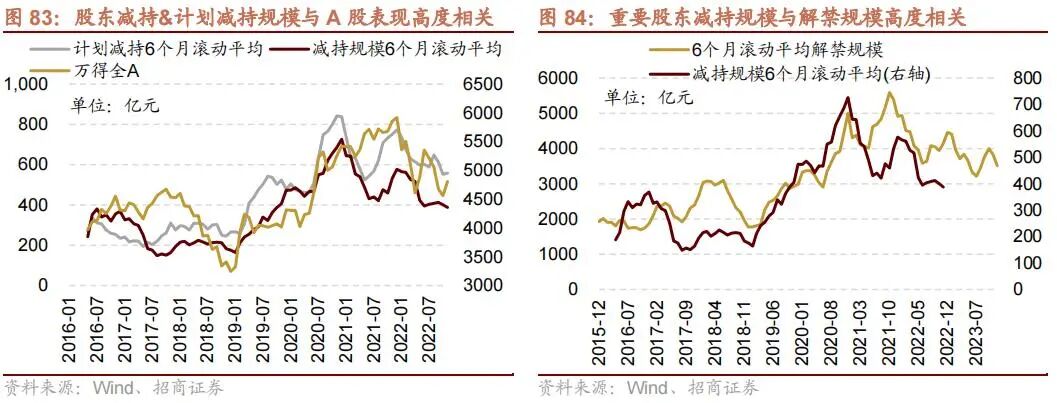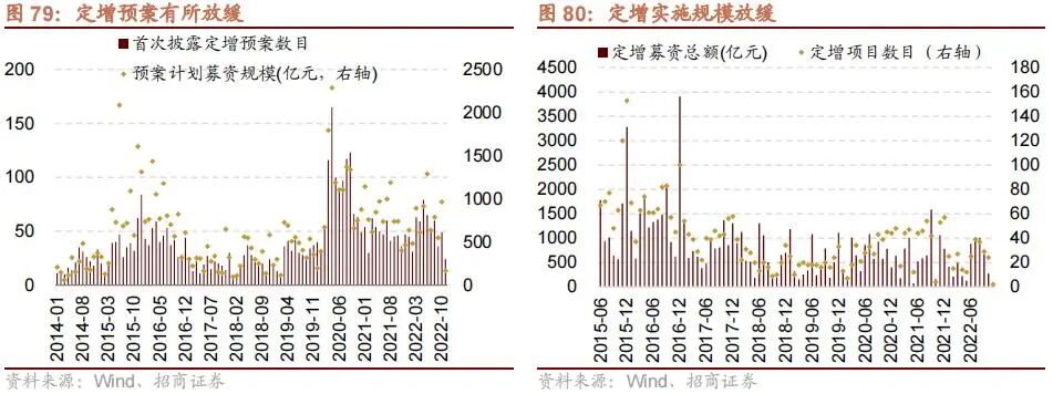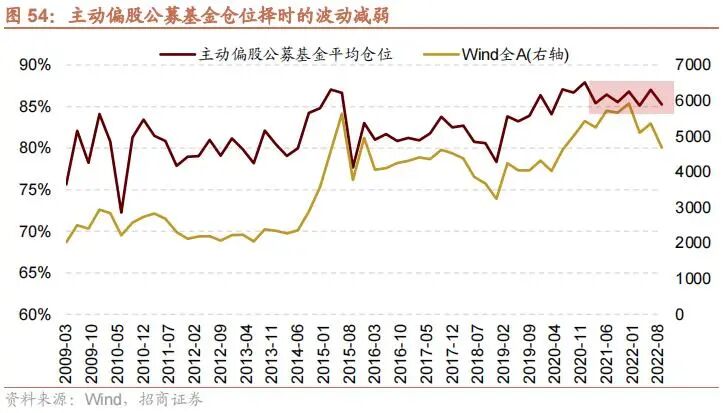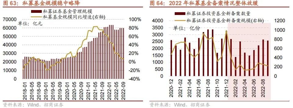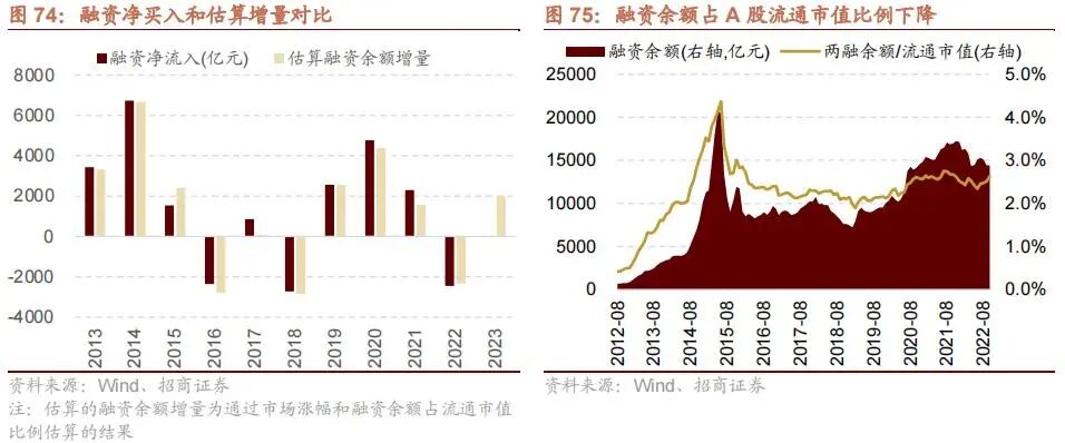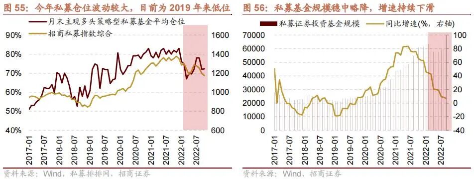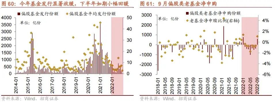 今年以来,市场波动较大,部分资金的仓位随着市场调整发生变化。那么,各类资金仓位如何变化,又处于怎样的历史水平?2022年以来,公募基金季报仓位虽有所变化,但基本处于历史中等偏上水平的窄幅波动区间,主动偏股公募基金平均仓位约85%-87%,显示主动偏股公募基金通过调整仓位进行择时的动力并不强。其中,普通股票型、偏股混合型基金的平均仓位分别较年初下降1.23%和1.61%;分别处于2019年以来的36%分位和50%分位。今年以来,私募基金收益波动剧烈,根据招商私募综合指数计算的年内收益为-9.78%,而私募基金的仓位随着市场的波动也出现了较大变化。截止2022年9月末,私募证券投资基金规模5.98万亿元,相比年初下降2.4%。与此同时,主观多头策略型私募仓位从年初的83%降至10月的72%,与2020年初的水平基本相当,处于2019年以来的36%分位。今年以来,保险资金投资股票和基金的占比一波三折,目前基本仍处于历史低位,为2013年以来的24%分位;2019年以来的7%分位。具体来看,截止2022年9月末,保险资金运用余额中,投资于股票和基金部分的比例为12.11%,较年初下降了0.59%。与2021年7月、2022年3月的水平基本相当。今年以来,在海外流动性紧缩环境下,外资持股在A股占比有所下滑,根据估算,2022年9月末外资持股规模约3万亿元,占A股总市值的比例约4.27%,较上年末的4.59%下降0.32%。从外资所持人民币金融资产结构来看,股票仓位在今年也有所下滑,不过仍处于历史较高水平。截止2022年6月末,外资所持人民币金融资产中,股票占比35.51%,相比年初的36.4%下降0.9%,处于2013年以来的87%分位。今年以来,由于市场波动加剧,赚钱效应减弱,居民申购基金热情下降。1-9月股票型和混合型老基金净赎回1975亿份,综合老基金的平均单位净值和平均仓位估算,1-9月老基金资金净流出1112亿元,其中9月公募基金老基金为净申购。从新发基金情况来看,截止目前,年内累计新发偏股类公募基金规模为3179亿元。综合新发基金和老基金申赎,则目前年内公募基金增量规模累计为2067亿元。从历史数据来看,在经历了公募基金发行的爆发期后,随着市场调整公募基金发行会明显降温,降至历史低位。而后期随着市场反弹,当万得全A达到前期基金密集发行期的成本后,公募基金发行会有小幅回暖(图中红色圈的位置,2009年6月、2015年10月);而当市场开启新一轮上行周期并有效突破成本线后,公募基金发行会迎来新一轮爆发(图中蓝色圈的位置,2014年8月、2020年1月)。在本轮公募基金爆发周期中,2021年下半年公募基金发行开始放缓,2022年以来随着市场调整,基金发行降至历史低位,下半年随着市场重新回到最近一轮公募基金爆发期的成本线,基金发行小幅回暖。展望2023年,预计随着A股转好,公募基金发行情况有望较2022年回暖,但是在经历2022年的调整后,随着市场反弹存量基金的赎回压力也会有所增大。假设2023年老基金累计赎回比例从2022年的3.5%扩大至5%,结合仓位估算,2023年老基金赎回造成资金流出规模约2040亿元。新发基金方面,参考历史,在2017年9月-2018年1月突破前期成本线后,基金月均发行规模相当于前期最低单月发行规模的7.5倍,本轮基金发行缩量以来,偏股类基金单月最低发行规模96亿,按照此倍数计算,为720亿元。据此,假设明年月平均新发行700亿份,则新发基金带来增量资金约8400亿元,按照平均85%仓位则对股市贡献的增量资金7140亿元。因此综合新发基金和老基金申赎两个因素,2023年公募基金净增量规模约5100亿元。今年以来,受市场环境影响,私募基金新增备案情况整体放缓。截止2022年9月末,私募证券投资基金规模5.98万亿元,相比年初下降2.4%。与此同时,私募仓位出现大幅下降,主观多头策略型私募仓位从年初的83%降至10月的72%。年末私募基金规模有望重回6万亿,并以当前仓位为基础进行估算,年内私募基金大约净流入260亿元。展望2023年,市场有望企稳回升,且私募基金是比较灵活的资金;考虑到近两年“公奔私”热潮为私募基金带来新的增量,预计基金规模有望回升,假设年度增速为4%,则年末私募证券投资规模将超过6.4万亿元。如果主观多头策略型私募仓位按照平均70%估算,私募基金整体仓位需要在此基础上打六折(参考2020年官方公布的私募仓位数据),则明年私募基金带来增量资金约1040亿元。2022年开始,资管新规正式实施,银行理财的发展步入新阶段。受市场影响,今年银行理财发行显著放缓。数据显示,今年1-10月银行理财发行产品数量较去年同期减少近50%,不过从银行理财存量规模来看,截止2022年二季度末,银行理财存续规模29.15万亿元,相比年初稳中略增1500亿元,同比增长12.98%。理财产品的配置结构方面,2022年上半年为应对市场波动,银行理财增加了对现金及存款的配置,对权益资产的配比稳中略降,且减少了对于债券的配置。具体来看,2022年6月末,银行理财资产配置中债券资产占比67.9%,较年初略降0.5%;权益资产配比略降至3.2%,降幅较此前已明显收敛;且新发的银行理财中超过8%为基础投资资产中含有股票的产品。考虑到银行理财的发行情况和市场变化,如果按照全年银行理财规模12.98%的增速以及3.2%的权益投资比例估算,则2022年银行理财为股票市场贡献的增量资金为1220亿元。展望2023年,随着市场企稳回升,银行理财产品收益有望得到改善,带动银行理财规模稳中有升,保守假设全年规模增速为13%,权益投资比例以3.2%为基础,则