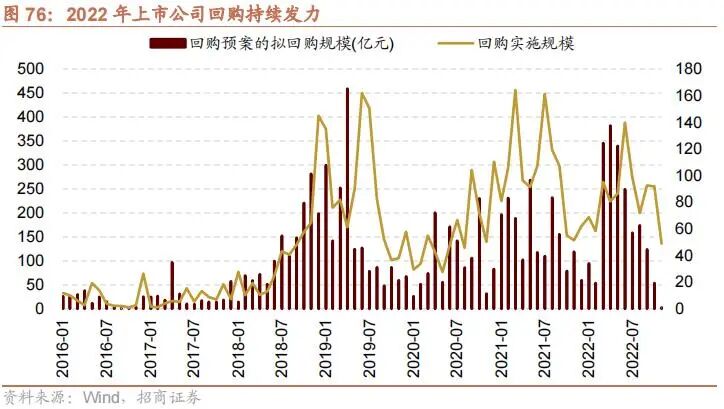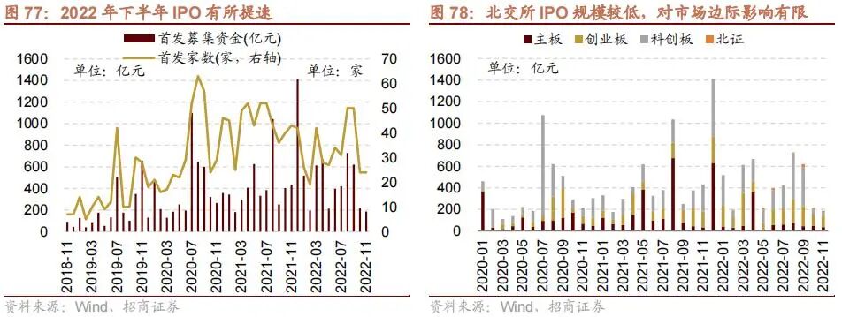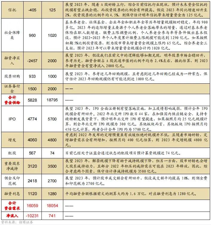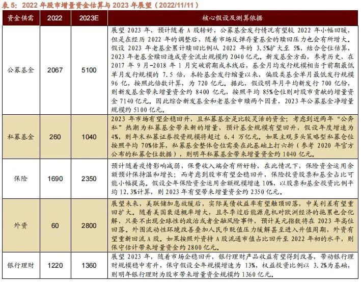不考虑股份划转的情况下,社保基金的资金来源主要包括彩票公益金分配和中央财政预算拨款。2022年划拨给社保基金的彩票公益金为402亿元,中央财政预算拨款每年200亿元,考虑股权分红再投资,股票投资比例按照20%计算,则2022年社保基金增量资金165亿元。基本养老保险基金方面,基本养老金委托投资快速推进。最新数据显示,所有省份均已启动基本养老保险基金委托投资,截止2022年9月末,基本养老保险委托合同规模1.6万亿元,假设其中年底之前这部分资金90%到账,投资比例20%,则保守估计全年增量资金规模310亿元。截至2022年6月,全国企业年金实际运作金额为2.73万亿元,按照8%的股票投资比例计算,上半年贡献增量资金约150亿元。从历史数据看,一般一季度增量规模较高,考虑到企业年金规模扩张,保守估计2022年全年增量资金规模270亿元。近几年职业今年规模增长加快,规模增速经历了先升后降的过程,2021年底职业年金规模1.79万亿,如果按照2022年增速15%计算,假设职业年金投资股票比例与企业年金相当,则年度增量资金约215亿元。综合以上各类保障类资金,2022年社会保障类资金贡献增量资金约960亿元。展望2023年,以上各类养老金大概能够维持年均900多亿相对稳定的增量贡献。而边际变化可能主要来自个人养老金的落地实施带来的增量。2022年11月4日,多部门密集出台4项个人养老金政策,标志着个人养老金制度正式落地实施,近期各家券商、基金、银行也积极进行各类产品平台相关测试。个人养老金享受一定政策优惠。一方面,在缴费环节,个人向个人养老金资金账户的缴费,按照12000元/年的限额标准,在综合所得或经营所得中据实扣除。另一方面,多家基金公司表示,对旗下符合要求的养老目标基金增设Y类份额,并修改基金合同和托管协议中对应的条件,Y类基金份额是仅面向个人养老金,根据相关规定可通过个人养老金资金账户申购的一类基金份额,且对Y份额管理费实行五折优惠。根据目前政策安排,国内个人养老金将主要通过投资各类养老金融产品而间接投资于股票市场,养老金投资注重投资的稳健长期性。个人养老金的落地实施,将为养老目标基金、养老理财等养老金融产品带来战略性发展机遇,并为股市带来中长期增量资金。通过对基本养老保险在职人数增速、缴费上限调整比例、个人养老金参与率等条件做出基本假设,预计2022-2023年个人年度累计缴费上限规模可能达到1290亿元,如果按照初期5%比例投资股票,则为股市带来增量资金规模上限约65亿元。综合养老金三支柱,预计2023年可以带来增量资金规模合计约1020亿元。今年以来,受美联储加息缩表的影响,外围流动性环境收紧,外资呈现出较大波动,截止目前仅小幅净流入。截至11月11日,北上资金年内累计净流入43亿元,如果按照北上资金在外资规模中的占比进行估算,则全部外资年内至今累计净流入规模约60亿元。外资持股占比在年内整体下滑,截止2022年6月末,外资持股占A股流通市值的比例降至5.21%,较年初下降了0.2%。北上资金持股占比在三季度进一步下滑至5%以下。展望未来,美联储加息放缓后,实际美债收益率有望触顶回落,中美利差有望重回扩大。随着美国衰退概率增大,且冬季过后能源危机对欧洲经济的拖累也会化解,只要不出现全球性的政治或者金融风险事件,预计美元指数将在2023年高位回落。外围流动性环境改善叠加人民币贬值压力缓解甚至进入升值周期,外资有望重新回流A股。如果按照外资持A股流通市值占比回升至2022年初的水平,则保守估计带来增量资金约2800亿元。截止目前,2022年内融资资金累计净流出2457亿元,目前融资余额占A股流通市值的比例约2.36%。融资资金整体属于顺势资金,其资金流向主要取决于市场表现。展望2023年,假设我们在前文中的逻辑能够如期兑现,明年股票市场企稳回升,参考历史,融资余额占A股流通市值的比例平均为2.4%左右,据此估算,则2023年融资资金有望净流入2000亿元。今年以来,上市公司回购持续发力,截止目前年内累计回购规模约933亿元。近几年上市公司回购实施规模的高点一般滞后于回购预案高点1-2个月,今年以来上市公司公布预案的计划回购上限规模达到1975亿元。展望2023年,参考近几年回购规模,且考虑到近几年回购已经成为一种常态,保守估计2023年回购规模仍有可能达到近1000亿元。今年以来,疫情拖慢了IPO进度并导致市场主体融资需求转弱,以及在上半年新股出现大面积破发后发行人持观望态度。以发行日期为参考,截至目前,年内累计共有355家公司进行A股IPO发行,对应融资规模4774亿元,略高于2021年同期的水平。其中主板、创业板、科创板、北交所分别IPO规模806亿元、1663亿元、2200亿元、105亿元。由此来看,北交所发行规模整体仍较低,短期对市场的边际影响相对有限。展望2023年,IPO全面注册制有望落地实施,加上疫情影响减弱,预计全年IPO规模会有所回升。2022年北交所IPO数目44家,在加强国内供应链安全、支持专精特新发展背景下,预计明年北交所IPO有望提速,如果按照月均25亿元规模计算,则全年北交所IPO规模为300亿元。其他板块而言,其他板块IPO按照月均450亿元计算,两者合计全年IPO约为5700亿元。今年以来上市公司定增实施规模整体明显放缓,截止目前定增融资规模合计为5244亿元,其中货币认购定增规模4060亿元。展望2023年,考虑到2022年发布的定增预案