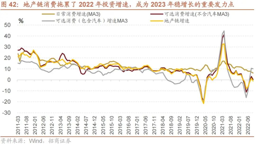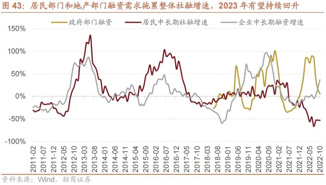 在2023年出口增速下滑,而地产投资也很难太高的背景下,将消费稳住,推动消费增速进一步回升成为拉动经济回升的关键。而2022年消费增速低迷的关键原因,一是疫情的反复,二是地产消费增速低迷。后者也有待稳地产的政策进一步发力,地产销售能够重回小个位数增长,如果辅以对耐用消费品的支持和鼓励措施,2023年以地产链消费为代表的耐用消费品增速回升也很有希望。若我们希望2023年GDP增速回升至4.5%左右,在出口对GDP增速接近0的背景下,需要投资和消费各自贡献5%左右的增速。总体来看,如果基建保持持续的投入力度,继续鼓励制造业和民间加大投资,再加上将居民部门融资增速拉正,那么,政府,企业和居民中长期社融均能出现边际改善,则全社会中长期社融增速才能有效回升,对冲外需下滑所带来的经济和就业下行的压力。