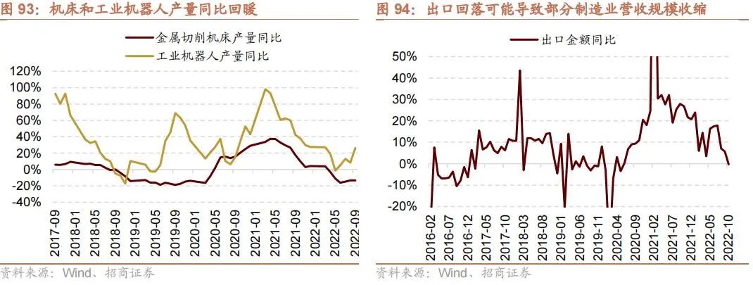 制造业投资已经连续数月改善,同时成本压力减轻或将带动制造业盈利走出底部。受益于制造业投资加速以及自动化升级等需求,通用设备如机床的需求已经出现好转,工业机器人作为制造业实现自动化升级的必需项也出现改善,产量同比均出现向上拐点;其他专用机械如包装专用设备、煤机设备、油气装备等需求均不错,部分工程机械在去年同期低基数下实现产销增长反弹,其改善可持续性仍待观察。由于海外需求放缓,10月最新数据显示我国出口增速转负,海外营收占比较大的制造业可能会面临一定程度的规模收缩。