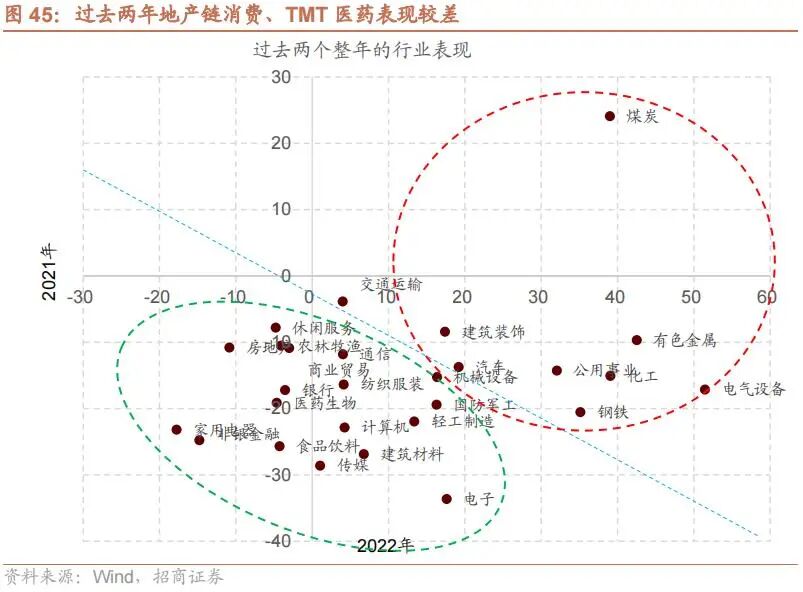 过去两年,中国自2021年的类滞胀,到今年逐渐进入下行周期,所以在过去两年类似煤炭、化工、钢铁等通胀受益板块,以及建筑、公用事业这种防御性板块表现相对占优。而地产链受损于地产与经济周期下行,科技医药基本面恶化,再叠加去年到今年的流动性恶化和流动性冲击,表现相对较差。但是我们都知道,风水是轮流转的。