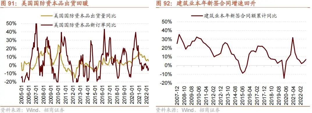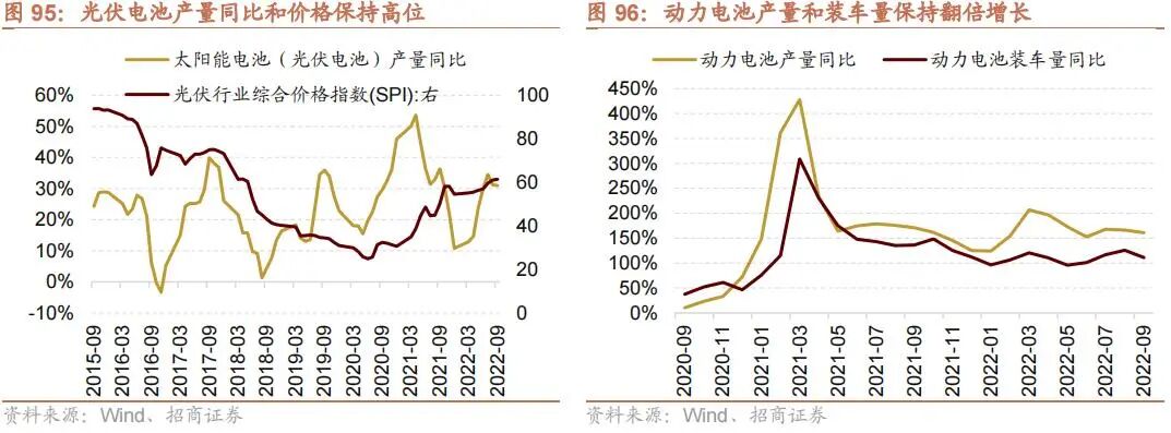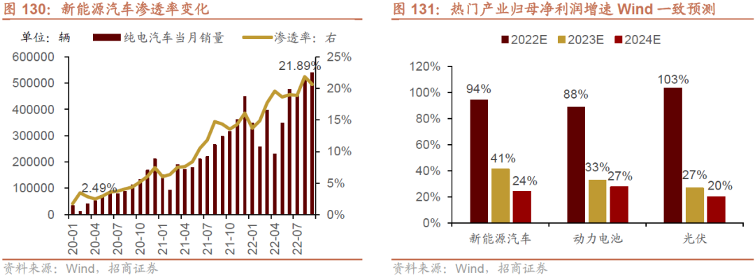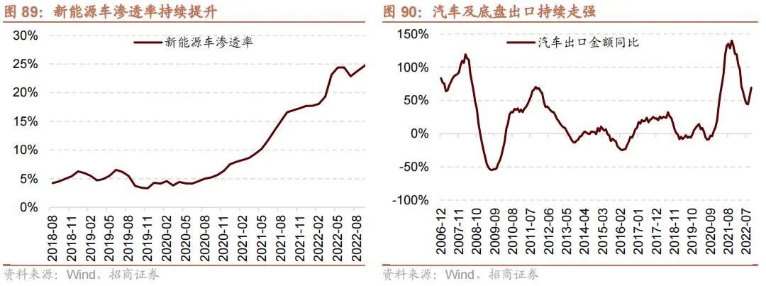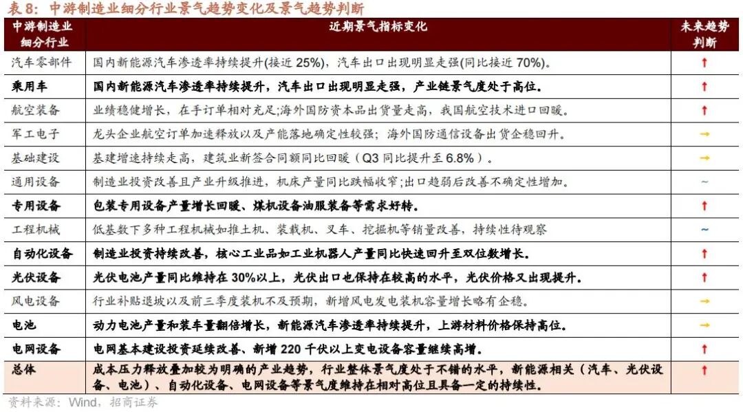 中游制造业:成本压力释放叠加较为明确的产业趋势,行业整体景气度处于不错的水平,新能源相关(汽车、光伏设备、电池)、自动化设备、电网设备等景气度维持在相对高位且具备一定的持续性。制造业可以享受到上游价格下降带来的成本红利,部分领域毛利率已经出现增厚。由于制造业在此之前经历了盈利修复,因此目前资本开支出现持续明显回升,部分景气度较高的领域如汽车、电新等进行产能扩张的意愿较为强烈。受益于较为明确的产业趋势、政策支持以及成本压力缓解等,中游制造业有望保持不错的景气度,并且更快的进入新一轮盈利改善周期中。乘用车、汽车零部件等行业景气度处于高位,受益于国内新能源渗透率持续提升,新能源汽车产业链景气度持续改善;三季度以来汽车出口进一步走强,10月出口金额同比已经接近70%,海外新能源汽车需求提升再次提振了行业景气度。军工板块业绩增长相对稳健,二十大报告中提到国防科技和武器装备重大工程等,叠加国企改革等产业趋势较为明确,军工企业在手订单为营收端带来较强的保障;近期美国国防资本品出货量/新订单、国防和航天设备产出指数、高科技产品航天进口同比等景气度指标均在回暖中,我国航空航天技术进口同比跌幅也出现明显收窄,军工板块尤其是航空装备领域景气度较为不错。
