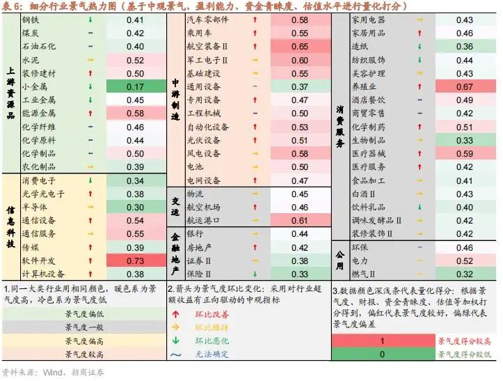 ⚑ 行业景气趋势展望:60个细分领域评估和5大景气改善领域。上游资源品景气度偏弱,中游制造业景气度处于不错的水平,消费服务和金融地产景气度偏中性,信息科技企稳且边际好转。短期内新能源、养殖等板块景气度较高且业绩兑现能力强。预计景气度改善的5大领域:医药、信息技术部分、高端装备、地产及地产消费、疫后修复板块。预计未来景气度改善空间较大的5个细分行业依次是软件开发、医疗器械、化学制药、自动化装备、传媒。