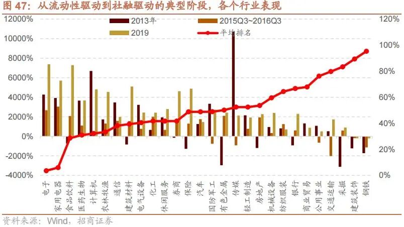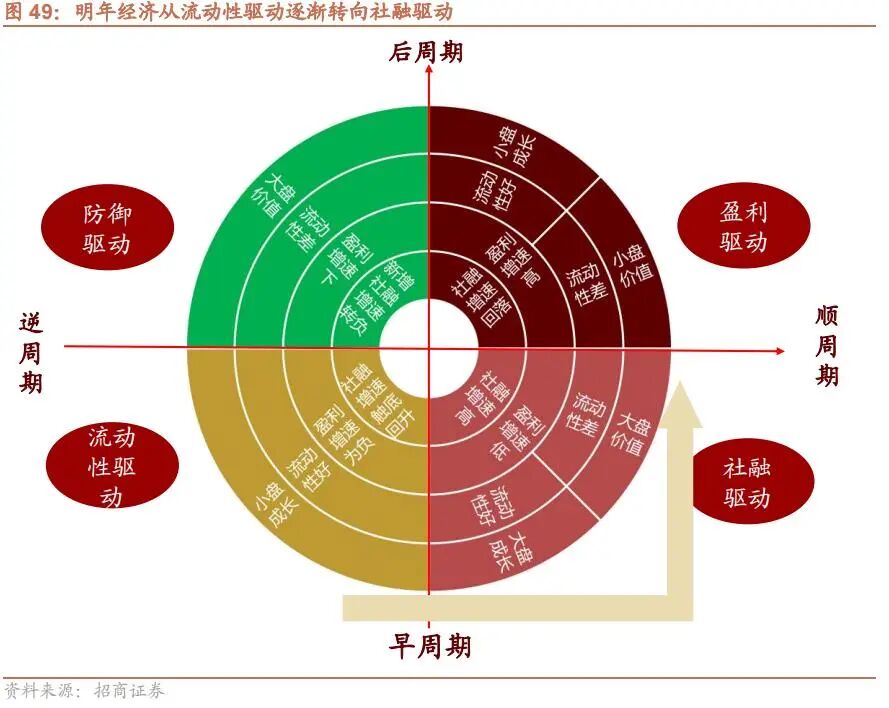 考虑到当前外需压力较大,房地产只能稳住而不能刺激,基建基数较高空间相对有限,因此,新增社融增速难以太高,股票市场流动性难以太紧缩。因此,2023年复苏的确定性较高,但空间有限,会出现阶段性复苏预期修复的大盘风格占优。但更多的可能会围绕有独立景气和政策支持的领域进行偏主题、聚焦产业趋势和局部景气高增长的方向进行投资。类似2013年和2019年。2013年、2015Q3~2016Q3、2019年表现相对占优的行业主要是电子、通信、计算机、医药等偏成长的方向,以及受益于稳增长发力的食品饮料和家电这两个典型的社融和地产恢复受益板块。这符合我们此前提出的风格轮动示意图,在从流动性驱动逐渐转向社融驱动过程中,小盘成长、大盘成长这种偏成长性指数会相对占优。