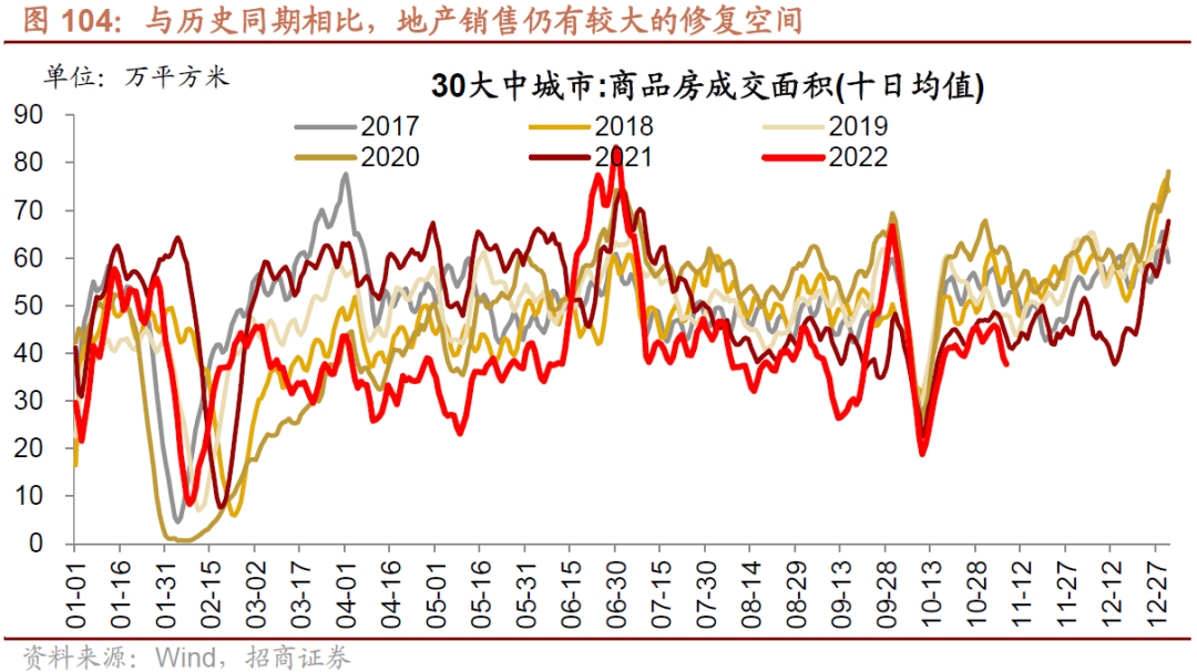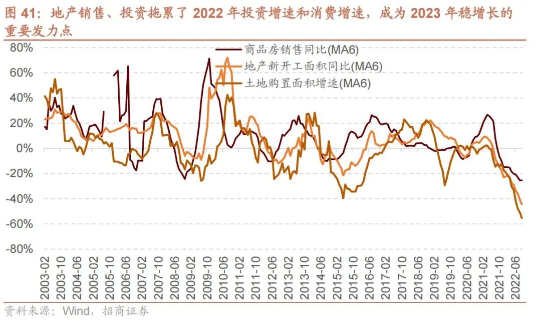 若以人民币计价增速来看,自2021年下半年开始至今年8月,涨价是对出口产生正贡献的关键原因,但是随着供应链价格大幅下降,原材料成本下降,到2022年九月,价格因素已经不再对人民币计价出口产生正面贡献。而到了2022年下半年,人民币对美元开始贬值,贬值又对以美元人民币计价的出口产生正贡献,2022年10月,人民币贬值对人民币计价出口增速贡献超过10%,如果人民币兑美元在这个位置附近保持稳定,明年上半年,贬值仍能给人民币计价出口产生10%左右正贡献;使得明年上半年只要美元计价出口增速不回落至0%以下,人民币计价出口增速仍能保持正贡献。但是到2023年下半年,如果美联储加息结束,人民币兑美元重回升值加上明年出口价格可能会回路,下半年以人民币计价出口增速转负的概率较大。中国的财政货币政策基本原则是逆周期调节,在全球经济尚可,出口尚可之时,中国就业和经济数据不会太差,因此尽管今年收到疫情反复影响,经济增速有压力,政府加大了基建建设力度,但是,对于房地产仍然保持了相当的定力。受到房地产部门新增中长期社融大负数拖累影响,2022年全年,中长期社融增速低迷。2023年,全球经济进入下行周期,中国的出口将会面临压力,过往经验,我们将会加大内需刺激力度以应对外需下滑,因此新增中长期社融增速一般都会明显回升。2022年已经对基建和制造业给予了较大的支持力度,但是受到地产投资增速双位数负增长的拖累,整体投资增速并不高。在基建和制造业增速已经较高的背景下,即便2023年保持一定的投入力度,但增速在高基数背景下仍可能下行。如果希望今年5%左右的投资增速不进一步下行,那么稳地产就是稳增长的重要方向,至少在2023年不要贡献负增长。由于2022年地产销售、新开工和土地购置增速大幅下滑,基数明显下降,房住不炒的政策得到有效落实。未来地产政策边际放松,叠加保障安居性住房投资增加和保交楼的提速,将地产销售、投资、土地购置在2023年拉到小各位数正增长,并不是把房地产作为“刺激”经济的手段,而是促进房地产健康发展,满足居民正常的刚需、改善性住房需求的应有之意。近期,房地产支持政策持续边际改善,2023年地产出现阶段性恢复的概率较大。