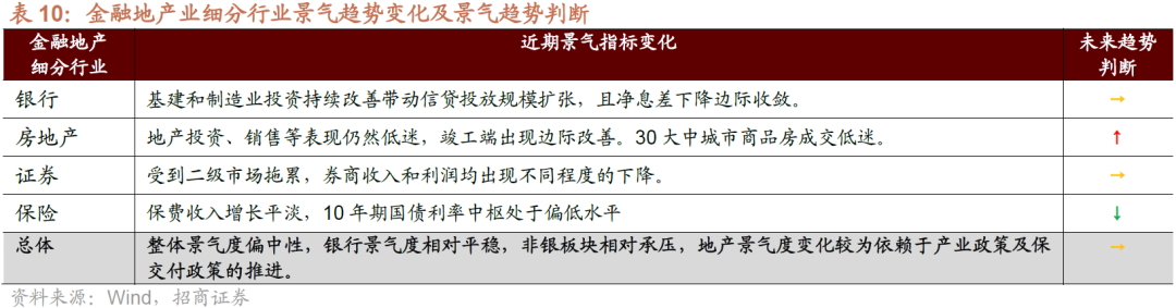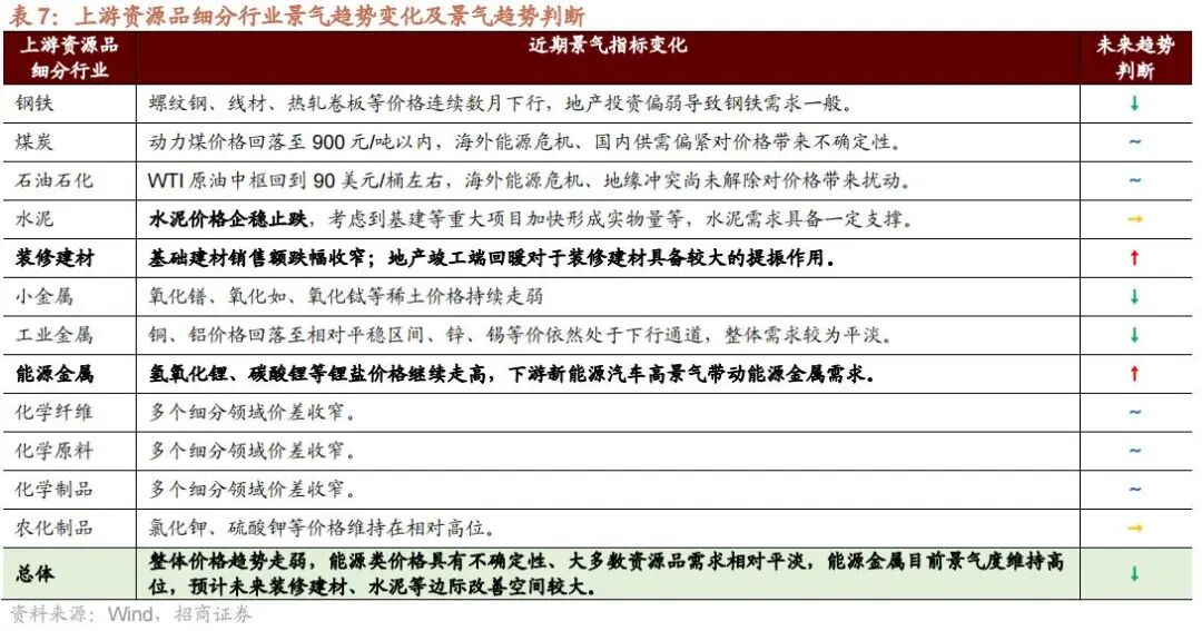 高频数据显示原油、天然气、动力煤等价格仍处于高位回落中,钢铁、工业金属等需求也较为平淡。目前WTI原油回落至90美元/桶附近,但海外能源危机尚未解除以及地缘政治冲突对于能源价格带来较大扰动,因此煤炭、石油石化等景气度趋势具有一定的不确定性或偏弱。由于经济需求偏弱以及地产投资偏弱,螺纹钢、线材、热轧卷板、工业金属等价格连续数月持续回落,整体需求较为平淡。