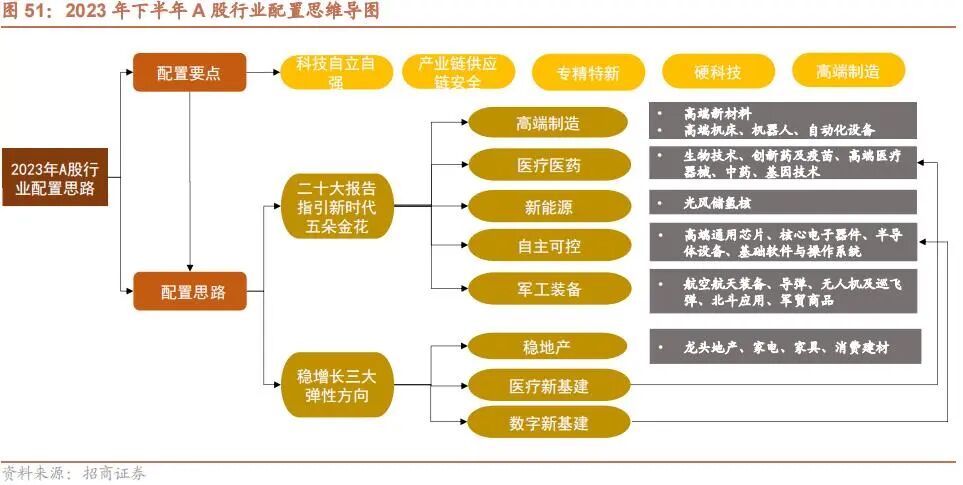 赋码管理成为科学精准做好防控工作的关键动作,但是,目前全国各地的健康码不统一,各地数据没有打通,赋码标准也不一致,导致人口在不同城市之间流动受到不同程度的约束。国务院办公厅于10月28日发布了《全国一体化政务大数据体系建设指南》,提出加快全国一体化政务大数据体系建设,积极推进医疗健康、社会保障、生态环保、信用体系、安全生产等领域主题库建设。2022年11月,《“十四五”全民健康信息化规划》印发,到2025年,初步建设形成统一权威、互联互通的全民健康信息平台支撑保障体系,基本实现公立医疗卫生机构与全民健康信息平台联通全覆盖。总的来看,数字经济是当前中国经济的重要增长点,也是稳增长可以发力的重要方向,在当前经济下行压力加大,疫情防控压力加大的背景下。医疗新基建和数字新基建有望成为下一个阶段稳增长发力的一个方向。相关医疗器械医药和计算机的公司值得重点关注。综合以上部分的所有内容,我们认为2023年的行业配置思维导图如下所示:对应的,我们梳理了值得跟踪的细分赛道和产业趋势投资思维导图,详细逻辑见后文第九章。