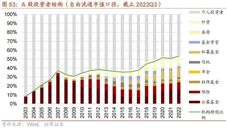 A股投资者机构化进程持续进行中,2022年机构持仓占比相比2021年继续稳步提升。具体来看,自由流通市值口径下,截止2022Q3机构持仓占比53.36%,其中,公募基金、私募基金、外资持仓分别占比15.55%、9.86%、8.79%。