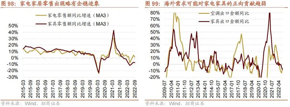 电网基本建设投资延续改善、新增220千伏以上变电设备容量继续高增、用电量等景气均处于改善中。受益于稳增长政策以及电网升级改造,电网投资持续走强,电网设备盈利也相对稳健,四季度进入施工旺季之后特高压等基建项目将会逐渐落地,明年产业链相关公司可能会加速释放业绩。消费服务:整体景气度偏中性,内部分化较为明显,地产链消费具有边际改善空间,外出消费或受制于出行半径,必需消费、养殖业景气度维持,医疗器械、医疗服务等景气度持续提升。消费服务行业依然呈现分化态势,整体而言受到以下因素的共同作用,首先,疫情扰动下部分行业消费场景受限,如旅游餐饮、免税等收入规模难以扩张,其次,原材料价格下降对于部分消费品制造形成利好,如家电、乳品饮料等行业毛利率趋于稳定甚至改善;最后,如果地产销售进一步改善或者出行限制缓解,那么消费服务行业多数领域景气度均会受到提振。以下景气趋势的判断均是基于目前的情形进行外推。近期家电、家居、装修装饰等地产消费板块景气度较为平淡,低基数下空调冰箱等产量增长有所回暖,零售端数据仍然低迷;不过受益于上游原材料成本压力减轻,家电板块毛利率出现企稳迹象,预计海外业务对于家电板块的贡献可能会有所弱化。考虑到地产竣工端的修复以及商品房销售跌幅收窄等,家电、家居和装修装饰板块景气具备企稳且边际改善的可能性。