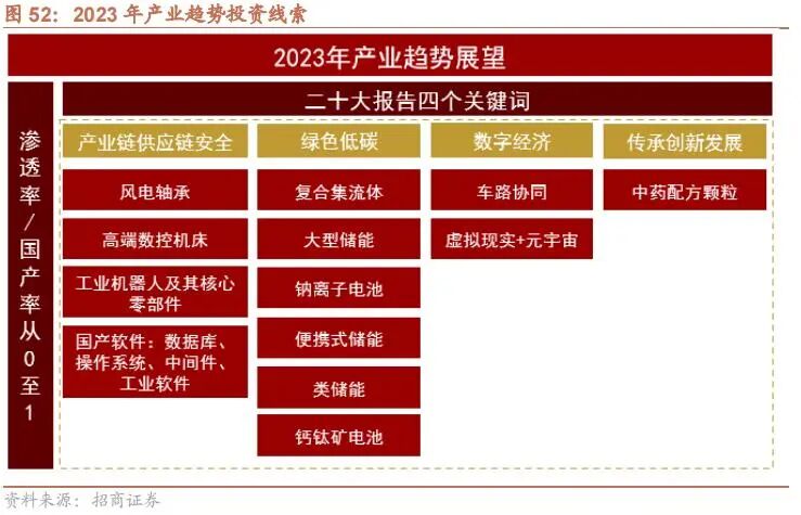 ⚑ 产业趋势展望:赔率与确定性,关注从0到1。围绕二十大报告,结合从0到1的产业逻辑,建议关注:(1)绿色低碳+渗透率从0-1:关注复合集流体、大储、类储能、便携式储能、钠电池、钙钛矿电池;(2)供应链安全+国产率从0-1:关注风电轴承、高端数控机床、工业机器人零部件、国产软件;(3)数字经济+渗透率从0-1:关注车路协同、元宇宙;(4)传承创新发展+产业新阶段:关注中药配方颗粒。