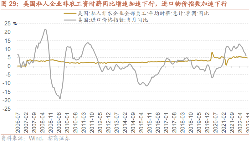 2022年美联储连续加息75BP,将联邦基准利率上限从0.25%提升至4%。主要原因是通胀出现了过去40年最大幅度的攀升。2022年11月议息会议,美联储仍然表示,“坚决致力于降低通货膨胀;没有迹象表明通货膨胀正在下降。重申回归2%的通胀目标将使自身保持限制性紧缩的政策立场”。通胀成为下一阶段美联储货币政策的关键变量。观察美国通胀最重要的领先指标和CRB综合指数。CRB综合指数是衡量一篮子大宗商品平均价格的指数,是通胀的关键原因之一,每当CRB明显攀升,都回来带通胀攀升,反之,当CRB综合指数转负之后,随着成本压力减轻,通胀增速也有望明显回落。而10月CRB综合同比转负,美国CPI也终于出现了超预期下行,美国核心CPI拐点出现。随着美国经济增速回落,通胀回落,美联储11月议息会议大概率是最后一次加息75BP。未来加息2-3次后,2023年美联储加息结束。2023年下半年是否会重启降息,需要看届时的通胀和经济运行情况。除此之外,美国非农工资时薪同比增速加速下行,现实“工资-通胀”螺旋没有形成,进口物价指数加速下行,显示美国输入通胀的压力减轻。经济的削弱,通胀预期的下行,市场预期美联储加息节奏和加息高度进一步放缓,于是美债收益率和美元指数开始进入下行周期。