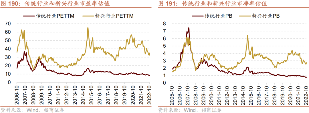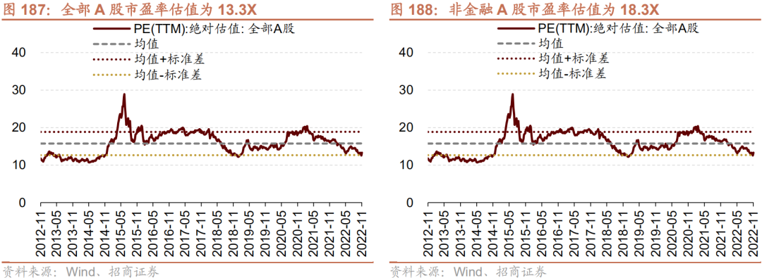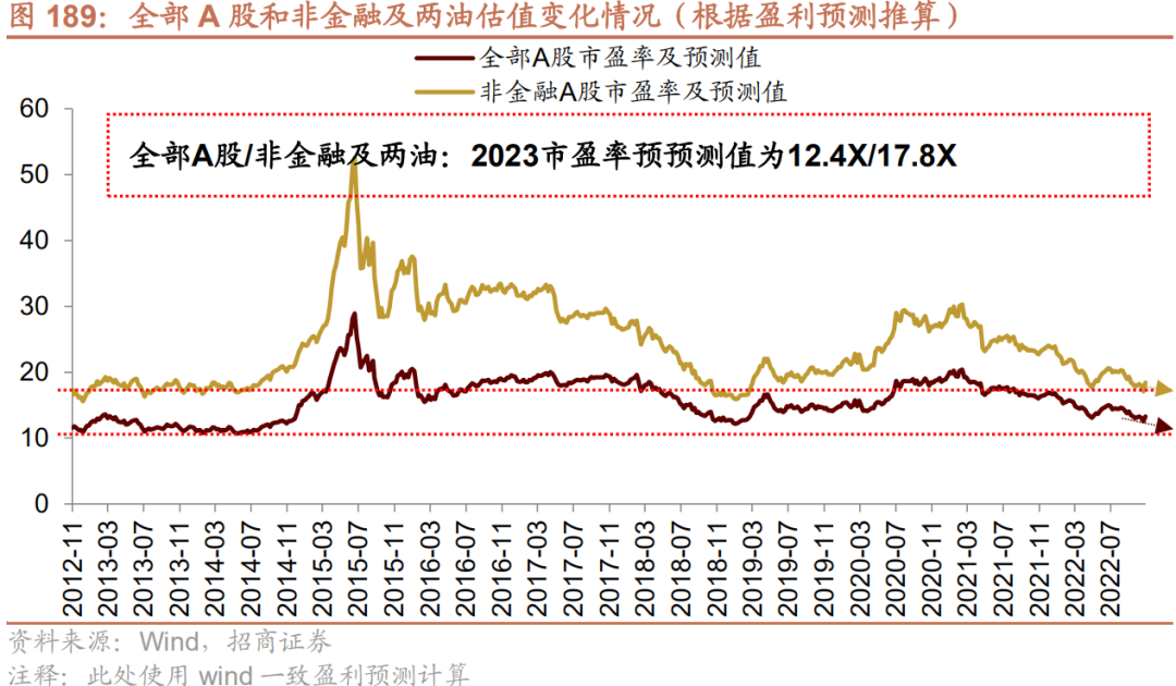 根据前文对于A股盈利预期并采用自下而上的方法来推算未来估值的变化情况,全部A股2022年/2023年净利润增速测算值分别为2.7%/7.3%,2023年盈利增速对应的市盈率水平为12.4倍;非金融及两油2022年/2023年净利润增速测算值分别为1.3%/9.5%,2023年盈利增速对应的市盈率水平为17.8倍。考虑到2022年及2023年盈利增长之后,当前A股估值水平处于相对合理甚至偏低的水平。