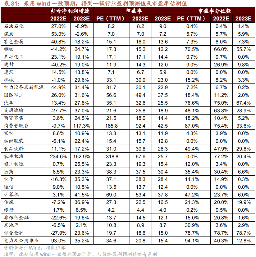 从一级行业估值来看,大部分行业板块市盈率水平下滑至历史中位数水平以下。一级行业中,汽车、消费者服务、综合金融、电力及公用事业等行业目前估值水平较高,均高于历史水平的70%分位;交通运输、食品饮料、计算机等行业估值水平下滑至历史估值中枢附近;石油石化、煤炭、有色金属、基础化工、电力设备及新能源、建筑、建材、家电、纺织服装、农林牧渔、通信、银行等板块处于历史估值低位。通过行业间估值对比发现,国防军工、消费者服务、计算机等行业的估值水平相对较高,市盈率大约保持在50倍以上;石油石化、煤炭、建材、建筑、家电、农林牧渔、通信、银行、非银金融和房地产的估值水平较低,市盈率估值处于15倍以下。消费品行业估值波动较大,受疫情散发频发、消费场景受限的影响,可选消费和必选消费板块估值均震荡下行;同时受地产产业链景气度较低迷的影响,以家电、汽车为代表的可选消费估值略有下滑。下半年,受疫情反复影响,需求受挫,大众品前期囤货导致原材料成本下行未体现在报表,以食品饮料为代表的必选消费板块估值出现较大下滑,可选消费领域估值也有小幅下行。目前汽车行业PETTM处于历史76.6%分位,商贸零售处于历史18.2%分位,消费者服务处于历史87.0%分位,食品饮料处于历史49.4%%分位。TMT领域估值分化较大,通信估值相对较低,电子、计算机估值相对较高。目前通信板块PETTM为13.5 X,处于历史估值底部。电子板块PETTM为37.1 X,处于历史14.1%分位。计算机板块2022年5月以来估值水平不断修复,信息安全、医疗信息化、信创等子行业有望保持较高景气度,目前行业整体估值69.0 X,处于历史47.2%的水平。金融地产和上游资源品如钢铁、石油石化等板块等仍处于历史低估值水平,但在稳增长持续发力的背景下,低估值的金融地产有望小幅修复。上半年受俄乌冲突影响,资源品供给受限,价格较大幅上涨,石油石化、煤炭等估值保持较高水平;三季度以来受内外需求疲软影响,资源品价格高位回落,板块估值持续下挫。金融地产领域,随着稳增长政策的持续推进以及地产宽松政策的落地,房地产投资逐步改善回暖,目前行业估值提高至历史中下水平,银行板块目前估值4.2X,处于历史0.2%分位,房地产板块目前PETTM为10.8X,处于历史30.9%的水平。从2023年估值和盈利匹配度来看,PEG围绕在1附近甚至明显小于1的行业主要集中在银行、建筑、建材、非银金融、有色金属、基础化工、机械、汽车、电子、计算机等板块。