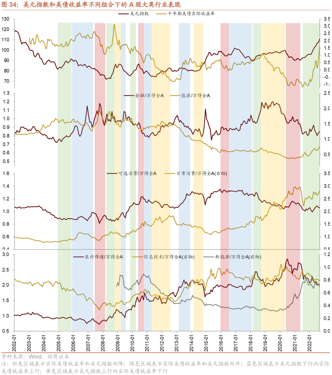美债收益率和美元指数强弱都会影响全球资本在中美之间流动,2014年资本市场加速开放之后,2015年开始,A股整体表现与人民币兑美元的趋势高度趋同,全球资本流动对A股的影响日益显著。鉴于美元指数和美债收益率是我们衡量外部流动性环境的两个重要变量,且美元指数和美债收益率影响A股的机制有所差异,这里我们将美元指数和实际美债收益率作为两个维度,构建四种组合下的外围流动性环境,即实际美债收益率和美元指数双降(图中红色区域);美债收益率和美元指数双升(图中绿色区域);美元指数下行而实际美债收益率上行(图中蓝色区域);美元指数上行而实际美债收益率下行(图中黄色区域)。美元指数下降而美债收益率上升区间(蓝色区域):A股多上涨或者震荡,而从市场风格来看,大盘价值风格、上证50指数获得超额收益概率更高。这与前文我们的分析是一致的,美元指数下降往往意味着流动性好转,对A股形成正面支撑,而美债收益率上行影响A股估值定价和风格,价格风格占优。美元指数上行而美债收益率下降区间(黄色区域):A股多上涨,只有一个阶段表现为下跌,即2011-2012年由经济下行主导驱动的实际美债收益率回落阶段,再加上美元指数上行导致外围流动性环境收紧,故A故出现双杀局面。市场风格方面,成长风格有超额收益率,但是大小盘不一定,大盘成长与中证1000代表的中小盘成长风格获得超额收益的情况各半,这与“美债收益率影响A股成长价值风格而对大小盘影响不稳定”的结论一致。美元指数和实际美债收益率双升的区间(绿色区域):A股多下跌,主要是美元指数和实际美债收益率双升往往处于美联储货币政策紧缩周期,对全球流动性环境都造成冲击,在这样的环境下,A股往往也会受到负面影响。市场风格方面,在此环境下,大盘价值、上证50更抗跌,防御属性凸显,获得超额收益。美元指数和实际美债收益率双降的区间(红色区域):A股多上涨,美元指数和实际美债收益率双降往往伴随着美联储货币政策转向宽松,全球流动性环境转好,利好A股表现。市场风格方面,成长风格具有较稳定的超额收益,且往往是先大盘成长风格后小盘成长风格。进一步地,从美元指数和实际美债收益率四种组合下大类行业的表现来看,美元指数下降而美债收益率上升区间(蓝色区域):从A股各大类行业表现来看,金融和能源行业在此情况下获取超额收益的概率较高。金融和能源行业未取得超额收益的一个阶段是在2013年美元指数降且实际美债收益率升的区间,当时A股主板和创业板冰火两重天,表现更强势的是信息技术、可选消费和医药行业,尤其信息技术行业受益于移动互联网的发展表现远超其他行业。美元指数上行而美债收益率下降区间(黄色区域):这种环境下信息技术行业受益于美债收益率下行而在多数时候获得超额收益。这种组合环境下信息技术行业未获得超额收益的一个阶段是在2011H2-2012H1,究其原因,当时实际美债收益率的的下行主要由美国经济下行而非流动性宽松主导驱动,且国内经济下行但货币政策未转向明显宽松,估值业绩双杀环境下具备避险属性的金融行业受益。美元指数和实际美债收益率双升的区间(绿色区域): A股下跌,金融、日常消费多获得超额收益。美元指数和实际美债收益率双降的区间(红色区域):从历史来看,美元指数和实际美债收益率双降区间,日常消费都获得了超额收益,信息技术、新能源等成长板块获得超额收益概率也比较高,这种环境下信息技术唯独没有获得超额收益的一个区间是2020H2-2021H1,相比之下表现较强的主要是食品饮料代表的日常消费以及新能源。因此,在美元指数和实际美债收益率双降的环境下,对A股而言主要是流动性好转、提估值,因此主要是那些未来成长确定性较高、成长空间大的行业会明显受益。总结以上两部分内容,我们可以将美元指数和实际美债收益率构建四象限组合,结果如下图所示:美元指数下降而美债收益率上升区间(蓝色区域):A股多上涨,大盘价值、上证50有超额收益,金融、能源;美元指数上行而美债收益率下降区间(黄色区域):A股涨跌不一;成长有超额收益,大小盘不一定;信息技术美元指数和实际美债收益率双升的区间(绿色区域):A股下跌;大盘价值、上证50有超额收益;金融、日常消费美元指数和实际美债收益率双降的区间(红色区域):A股多上涨;成长风格,从大盘成长到小盘成长;日常消费、信息技术、新能源。总的来看,如果2023年美债收益率和美元指数均加速下行,进入左下角象限的概率较大,则A股上涨概率较大,成长风格相对占优。那么类似医疗保健和信息科技这种偏成长性的方向相对占优。2022年中国出口以人民币计价前十月增速尚有双位数增长,对中国今年经济稳定产生了正贡献,但是到10月随着全球经济下行,以美元计价的出口增速单月已经转为负增长。按照目前全球经济下行的态势来看,2023年全年以美元计价出口增速负增长的概率较大。