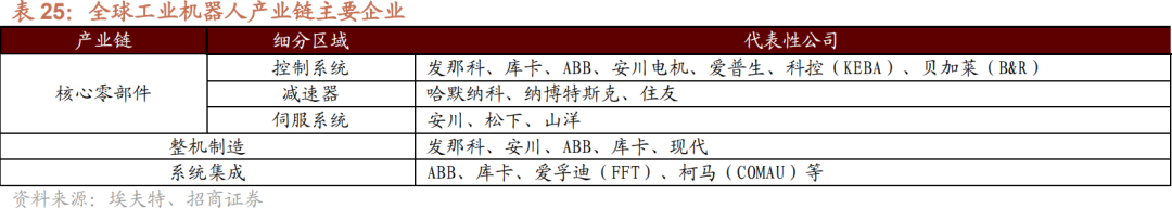 德国、日本也牢牢占据着工业机器人的主要市场份额。日本、德国的工业机器人水平世界领先,这主要因为他们具备先发优势和技术沉淀。日本在工业机器人关键零部件(减速机、伺服电机等)的研发方面具备较强的技术壁垒。德国工业机器人在原材料、本体零部件和系统集成方面有一定优势。从企业来看,ABB、发那科(FANUC)、库卡(KUKA)和安川电机(YASKAWA)这四家企业是工业机器人的主要供货商,占据世界约50%的市场份额。
