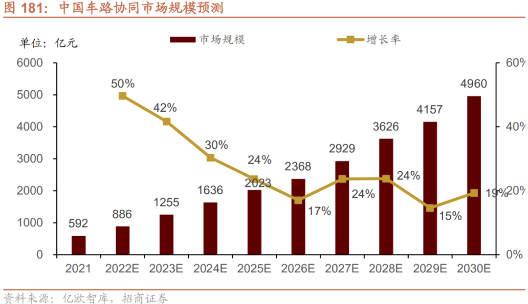 政策助力推动车路协同产业快速增长。2022年10月27日,工业和信息化部装备工业一司组织召开智能网联汽车推进组(ICV-2035)工作协调会,会议听取了智能网联汽车推进组近期工作进展情况报告,分析研判发展态势和未来趋势,聚焦行业发展关键问题和迫切需求,持之以恒推动我国智能网联汽车产业高质量发展。2022年11月,工信部发布《开展智能网联汽车准入和上路通行试点工作的通知(征求意见稿)》,遴选符合条件的道路机动车辆生产企业和具备量产条件的搭载自动驾驶功能的智能网联汽车产品,开展准入试点;对通过准入试点的智能网联汽车产品,在试点城市的限定公共道路区域内开展上路通行试点。根据亿欧智库预测,2030年中国车路协同市场规模有望达到4960亿元,2021-2030年CAGR有望达到27%。