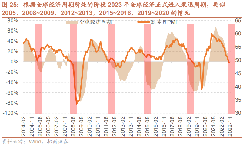 这种信念也是在2023年能够有效抵御美国发动新的打压制裁时,理解对A股影响的关键正面因素。而“中国式全球化”背景下,中国制造迈向高端化带来的在全球市场份额扩大,也是2023年寻找结构性机会的重要机会。2023年,全球经济大概率进入衰退或者类衰退的状态。我们将主要发达国家的进口、出口、生产、库存、价格等一系列能够表征全球经济的增速指标进行标准化处理后得到全球经济和周期指标。该指标目前正在快速下坠,2023年大概率跌入负值区间,按照我们的定义,进入衰退的状态。最新一期欧美日PMI回落至50以下,已经回落至荣枯分水岭以下。