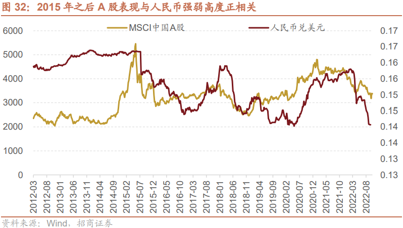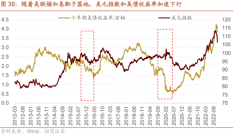 美债收益率的加速下行,而如果中国进行信用扩张带来利率中枢的回升,2023年中美利差有望重新回正,2023年人民币兑美元有望逐渐走强。