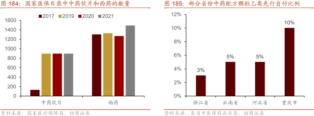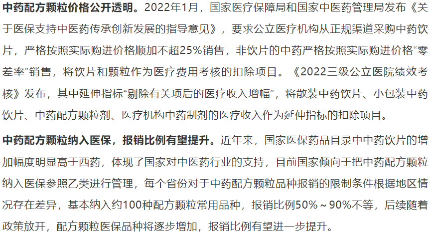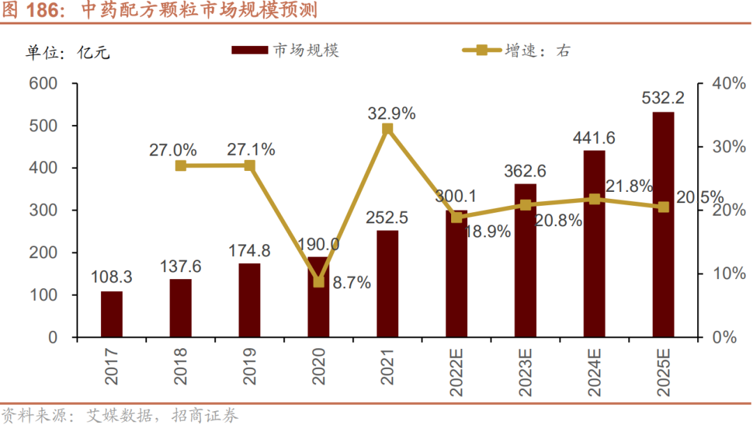 中药配方颗粒标准化程度高,方便携带。中药配方颗粒是由单味中药饮片经水提、分离、浓缩、干燥、制粒而成的颗粒,在中医药理论指导下,按照中医临床处方调配后,供患者冲服使用。作为中药饮片的衍生品和创新,中药配方颗粒具有标准化程度高、方便卫生、分量明确、便于保存、不易变质等优势。具体来看,中药配方颗粒是中药饮片的加工产物,同规格产品,中药配方颗粒价格一般高于中药饮片30%-40%。但是中药配方颗粒的便捷性,使得消费者对中药配方颗粒具有一定偏好,并愿意为其付出一定溢价,除此之外,中药配方颗粒采用大规模机械化、自动化、规范化生产管理,严格按照GMP要求并进行理化检测,可以满足中医临床配伍需求。中药配方颗粒国标出台,销售范围拓宽。2021年2月,国家药监局、国家中医药局、国家卫生健康委和国家医保局共同发布《关于结束中药配方颗粒试点工作的公告》,决定结束中药配方颗粒近27年的试点工作,对配方颗粒品种实施备案管理,其质量监管纳入中药饮片管理范畴,同时对配方颗粒生产、经营、使用各环节做出规范。2021年4月,国家药监局批准颁布了第一批中药配方颗粒国家药品标准(160个),10月,国家药监局又批准颁布了第二批中药配方颗粒国家药品标准(36个)。2022年5月,国家药典委批准颁布了2022年第一期中药配方颗粒药品标准(50个),截止目前,已批准颁布的中药配方颗粒国家药品标准已有269个。2021年11月,国家中医药管理局发布《关于规范医疗机构中药配方颗粒临床使用的通知》,将配方颗粒的适用范围由二级及以上中医院扩大至具有相关资质全部医疗机构,增加了中药配方颗粒的销售渠道,大幅拓宽中药配方颗粒的销售范围。中医医疗机构数量扩张,中药配方颗粒需求提升。2022年3月,国务院办公厅印发《“十四五”中医药发展规划》,根据规划到2022年,力争2022年社区卫生服务中心和乡镇卫生院设置中医馆的比例从81.29%提升至100%。2020年到2025年中医医疗机构数量从7.23万个提升到9.5万个,中医医院数量从5482个提升到6300个,中医医疗服务机构的快速扩张有利于加强终端推广覆盖面,提振配方颗粒行业需求。中药配方颗粒市场规模有望翻倍。中国医药工业信息中心数据显示,2021年中药配方颗粒市场规模已经达到252.45亿元,同比增长32.87%,2017-2021年期间,中药配方颗粒市场规模实现翻倍,期间CAGR为23.6%。随着中药配方颗粒销售范围由二级及其以上中医院向所有符合相关中医执业资质的医疗机构扩容,市场有望迎来数倍增长空间。根据艾媒数据预测,预计2025年市场规模将达到532.18亿元,2021-2025年CAGR有望达到20.5%。