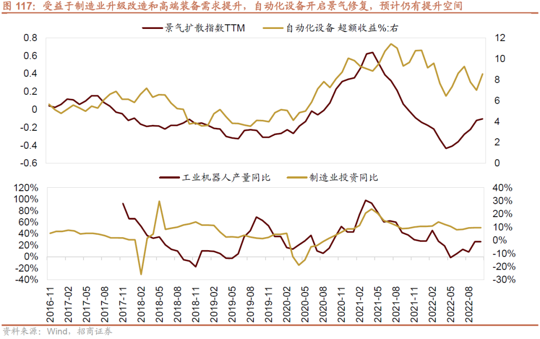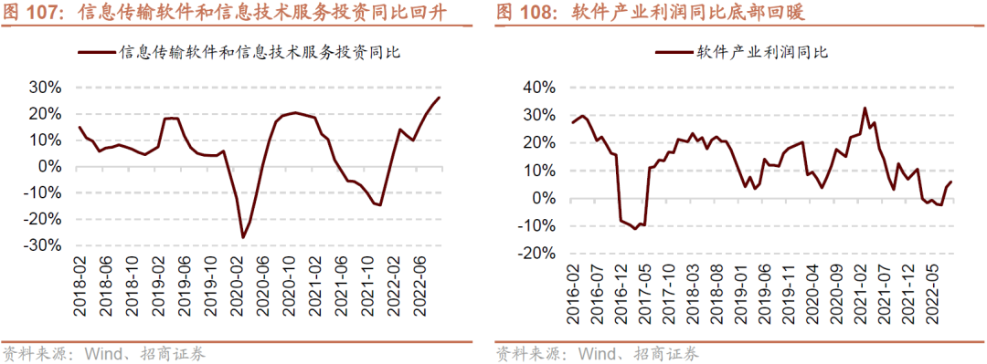 ▶ 信息技术部分领域持续获得产业政策端扶持,业绩底部或将出现,软件开发、计算机设备、传媒等行业景气度触底回暖受制于互联网行业政策打压及科技周期回落等多重不利因素交织,目前信息科技行业利润增长和公募基金持仓都落入较低的水平,年初以来信息科技板块业绩增速持续下滑。不过近期信息科技领域部分领域持续得到产业政策端的扶持,如国务院办公厅于10月28日发布了《全国一体化政务大数据体系建设指南》、工信部等五部门联合发布《虚拟现实与行业应用融合发展行动计划(2022—2026年)》,软件开发、计算机设备、传媒等行业景气度开始回暖,不排除在未来1-2个季度业绩端也将走出底部。景气度监测情况显示近期软件开发行业景气扩散指数触底回升,软件产业利润、信息传输软件和信息技术服务投资和用电量等景气指数均出现明显改善,党政信创需求带动软件行业景气度好转,预计未来金融IT、医疗IT等更多领域等也会带来较多的业务需求,其信创支出将会提升。二十大报告中提出“科技自立自强能力显著提升”“加快实施创新驱动发展战略”“以国家战略需求为导向,集聚力量进行原创性引领性科技攻关,坚决打赢关键核心技术攻坚战”“统筹发展和安全”并明确数字化转型的重要性等,软件和信息技术自主可控的重要性再次得到印证。产业政策端指引为游戏、VR、元宇宙等领域带来良好预期。11月1日,五部门联合印发《虚拟现实与行业应用融合发展行动计划(2022—2026年)》,其中产业生态要持续完善,我国虚拟现实产业总体规模超过3500亿元,虚拟现实终端销量超过2500万台等。游戏板块景气度具有底部修复的可能,VR在各个领域加速落地也带动硬件端需求提升。▶ 受益于制造业投资加速、成本压力减轻以及具有核心技术的高端装备类:自动化设备、通用设备、电网设备、航空装备等行业景气度仍有提升空间伴随着多个季度落后产能出清、海外需求扩张、成本压力减轻等,高端制造板块毛利率和盈利能力得到增长,同时进行产能扩张的意愿开始增强,三季报显示部分领域用于资本开支的现金明显增多,这与制造业投资持续扩张这一现象相吻合。二十大报告中提到,“实施产业基础再造工程和重大技术装备攻关工程,支持专精特新企业发展,推动制造业高端化、智能化、绿色化发展”“坚持机械化信息化智能化融合发展”“优化国防科技工业体系和布局,加强国防科技工业能力建设。”高端装备类行业发展空间较大。受益于制造业投资加速以及自动化升级等需求,通用设备如机床的需求已经出现好转,工业机器人作为制造业实现自动化升级的必需项也出现改善,产量同比均出现向上拐点;近期我国对于高新技术产品(航空航天技术、飞机等航空器)等进口需求明显增加,美国国防资本品的出货量及新订单,以及航天等高科技产品的进口需求也出现明显增多。目前来看,在成本压力减缓、资本开支意愿扩张以及具有核心技术产品需求提升的背景下,自动化设备、航空装备、通用设备、电网设备、通信设备等景气度均出现修复,预计未来仍有提升空间。值得注意的是,我国出口保持一定的韧性但下行趋势仍在,部分高端制造业的海外业务规模可能会面临一定程度的收缩,这可能会制约高端装备类景气度扩散程度。▶ 地产及地产消费(装修装饰、家居等)景气指标出现底部企稳的特征,景气度和盈利向上修复空间较大三季度以来地产销售跌幅出现一定程度的收窄,竣工端回暖幅度相对较大,包括投资、新开工在内的多项景气指标均出现了触底甚至企稳的迹象。伴随着行业供给端出清,龙头国企在拿地、新开工以及销售方面更加占有优势,目前龙头地产的市占率已经出现明显提高,未来行业集中度将会进一步提升。由于保交付等政策持续推进以及地产竣工端修复,预计地产链消费也有具备景气改善空间。目前装修建材、家居用品、装修装饰等行业盈利水平几乎落入历史最低的水平,业绩也转为负增区间;不过部分景气指标如基础建材销售额等出现企稳迹象。伴随着地产销售及竣工等指标继续修复,家居、装修装饰、装修建材等地产消费景气度将会触底回暖,并且业绩向上修复的弹性空间较大。