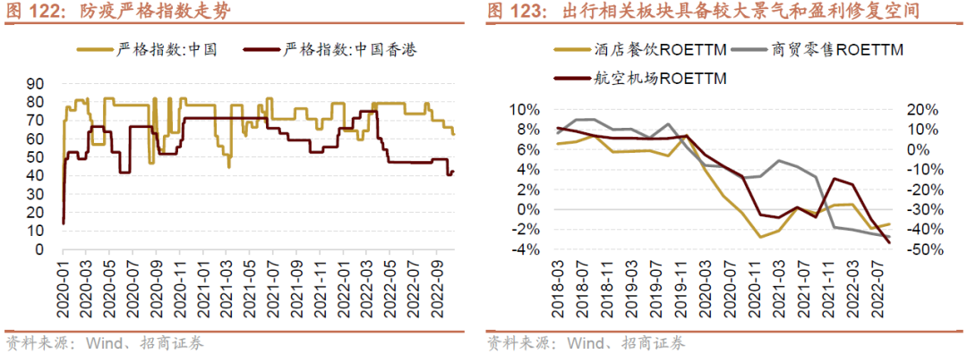 ▶ 若出行场景增多和半径扩大,疫后修复板块如外出消费相关领域酒店餐饮、商贸零售、航空机场将会迎来景气度和盈利修复由于出行场景受限,部分细分领域盈利能力持续下行或保持底部震荡,包括酒店餐饮、商贸零售、航空机场等,这些行业景气度尚未出现明确的底部企稳的信号。11月11日,国家卫健委员发布《关于进一步优化新冠肺炎疫情防控措施 科学精准做好防控工作的通知》,要求积极稳妥抓好防控措施优化调整。若未来居民外出消费场增多以及出行半径扩大,酒店餐饮、商贸零售、航空机场等细分领域将会迎来景气度和盈利的修复。整体来看,目前景气度较高的领域主要集中以下方面:受益于较为明确的产业趋势及产业政策支持,以新能源(乘用车、能源金属、电池、光伏设备)为代表的细分领域已经连续多个季度保持中观景气指标持续改善,盈利能力得到明显增强。新能源板块在过去两年保持了较快的盈利增长和较高的景气度,在高基数背景下,进入2023年之后景气度改善空间可能会边际收敛。除此之外,养殖、航运等细分领域处于景气周期内,并且在未来1-2个季度内盈利兑现能力依然较强。