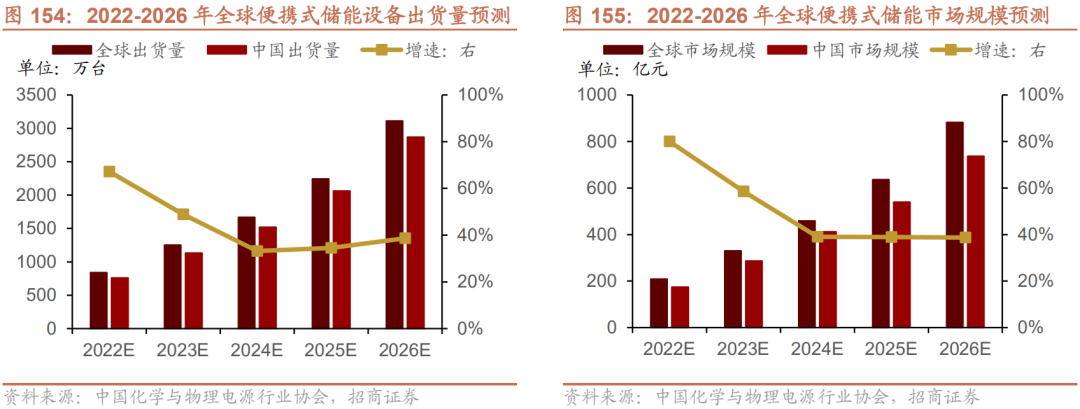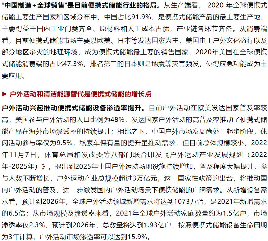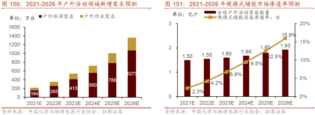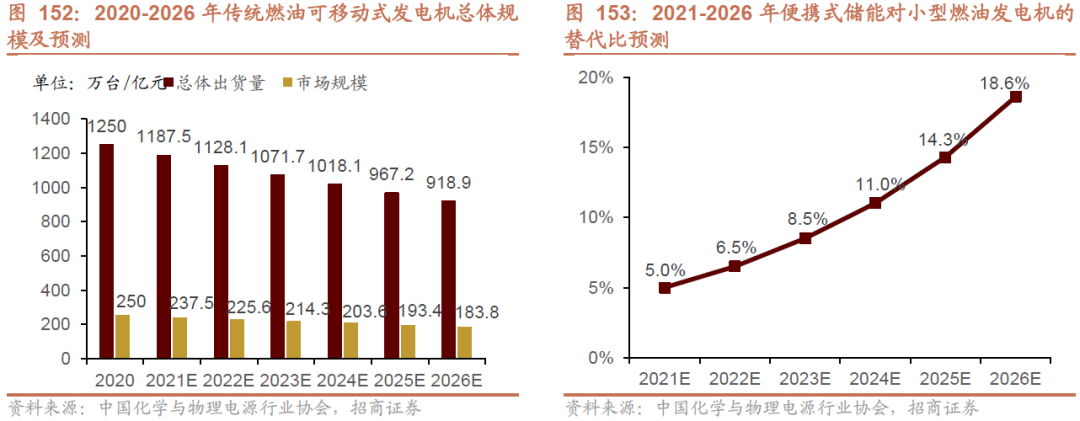 便携式储能具有大容量、大功率、安全便携的特点,适用场景众多。便携式储能电源简称“户外电源”,是一种替代传统小型燃油发电机的、内置锂电池的小型储能设备,可提供稳定交流/直流电压输出的电源系统,电池容量在100Wh-3000Wh,配有AC、DC、Type-C、USB、PD等多种接口,可匹配市场上主流电子设备,适用于户外出游、应急救灾、医疗抢险、户外作业等多个场景。便携式储能于2018年才开始起量,尽管行业发展时间较短,但其凭借绿色无污染、安全便携、操作简便、无噪音、大容量、大功率、可同时输出交流及直流电、适配性广泛等众多优点,精准匹配了新时代电力需求市场的消费痛点,几乎涵盖了所有的常用电子电气设备,广泛应用于户外出行和应急设备等多个领域,市场规模迅速增长,2016年全球便携式储能设备仅出货5.2万台,2021年出货量达到483.8万台,CAGR达到148%;2016年全球便携式储能的市场规模仅0.6亿元,2021年市场规模已达到111.3亿元。便携式储能的清洁低碳优势对小型燃油发电机具有良好的替代性。便携式储能设备轻巧清洁、使用方便,输出功率在1-3KW,而燃油发电机的输出功率在2-8KW,因此便携式储能设备对小功率燃油发电机具有替代性,中国化学与物理电源行业协会预测,便携式储能对小型燃油发电机的替代比率将从2021 年的5.0%提升至2026 年的18.6%。从市场规模看,2020年全球便携式电站市场规模在250 亿元,以便携式燃油发动机为主,预期2026 年市场规模将萎缩至183.8 亿元,保守测算,2026年便携式储能替代小型燃油发电机部分的市场规模至少可以达到66.2亿元。