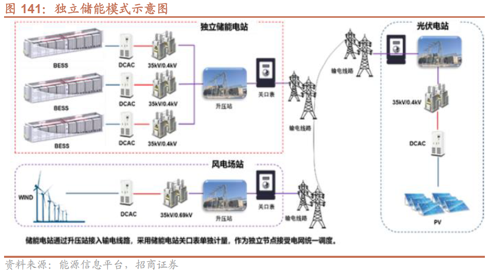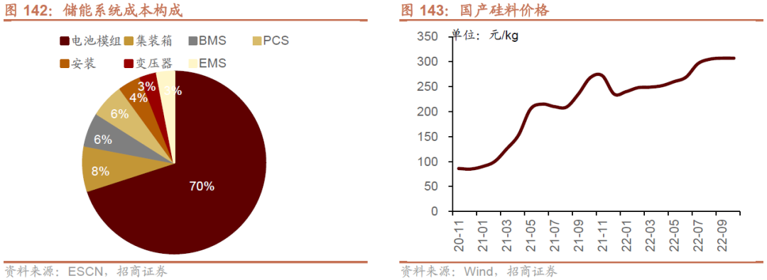 关键装备是复合集流体发展重要的壁垒和难点,需求强劲且仍在迭代。复合集流体对生产工艺及设备要求高,主流镀膜工艺上分为三步法、两步法,两者各有优缺点,可能适配不同基材(PP/PET)。磁控溅射设备制备难度较高且需根据复合集流体的工艺进行相应的调整,后端的蒸镀、水电镀设备也有较多的点需要优化。多家相关领域的装备公司在加速投入,潜在订单充足。同时,部分原有屏蔽膜、靶材等相关公司也有一定的装备设计或定制能力,可能有一定优势。在电池制备环节,超声波高速滚焊技术是锂电池前端制备的新增工序,能完整提供该设备及配套自动化设备的厂商较少,未来可能是电池装备上存在瓶颈的环节。大型储能是国内储能主力。储能可以分为大型储能与户用储能两大类别,其中大型储能主要指 MWh 级别以上的集装箱式系统,终端客户为大型电力公司或工商企业,主要销售方式为集采、招标等形式,B 端属性较强;而户用储能主要为 5-20kWh 的小型电池系统,终端客户多为分散的居民家庭,主要通过当地化的经销商、安装商网络进行销售,C 端属性较强。欧洲由于能源危机,电价高涨,户用储能进入爆发期,相比之下,国内电价平稳,户用储能需求较少,大型储能是国内储能主力,主要与大型的风光发电进行配套,以保证平稳的发电并网。目前国内大型储能项目盈利渠道主要为峰谷套利、调峰调频等辅助服务收益、容量租赁等。市场峰谷套利:峰、谷、尖峰时点价差提供套利,2021 年 7 月《关于进一步完善分时电价机制的通知》发布要求完善峰谷电价机制,目前国内大部分地区峰谷价差已经拉开了 0.7 元/kWh 以上,部分地区超过 1 元/kWh,尖峰电价更高,储能套利空间更大。辅助服务收益:2021 年底能源局修订发布《电力并网运行管理规定》、《电力辅助服务管理办法》将辅助服务主体扩大到新型储能。辅助服务收益为电网约定的辅助服务费用,目前各地差异较大,以调峰为例大致分布于0.1~0.9 元/kWh。实际这部分收益还需要考虑电网调度优先级等。容量/电量租赁:由于电网的互联互通、实时动态平衡,各次侧的储能发挥的功能并不能完全割裂。储能需求方可以通过租赁模式实现自身项目的储能配套,储能项目获得容量、电量租赁收益。独立储能可参与电力现货市场,商业模式进一步完善。近期山东出台了全国首个省级电力现货市场储能支持政策,明确独立储能可参与电力现货市场。进入电力现货市场后,充电时为市场用户,从电力现货市场中直接购电;放电时为发电企业,在电力现货市场进行售电,其相应充电电量不承担输配电价和政府性基金及附加。独立储能打破了原来电源、电网、用户侧等按并网点的分类标准和收益界限,是契合电网运行特征和实际需求的业务模式,也是政府鼓励的方向,增长可能更快,同时可能带动储能投资方由优先关注成本转向更加重视储能系统质量。根据招商电新团队统计,2021年末,国内备案共享储能项目达84个,总建设规模超12GW/24GWh,当前统计或已超过200个项目完成备案/公示,总容量约在60GWh上下。储能成本受碳酸锂、硅料等上游价格影响。锂电储能系统工程建设成本大致为约 1.5-2 元/Wh,其中储能系统占 90%以上。储能系统中又以电池占比最高,大致为 50%-70%(考虑电芯涨价后,占比提升),其他系统组件、管理系统分别占 20%、15%。直接推高储能系统成本的主要是电芯,2021 年以来碳酸锂的价格快速拉升,目前电池级在 57 万/吨上下,仍然在高位。此外 2020 年开始的缺芯造成 IGBT 等器件价格提升,也小幅度的增加了储能成本。此外,由于目前大部分储能项目还是在发电侧与新能源电站配套,光伏产业链价格在高位也间接影响储能的接纳度。三部门约谈硅料企业,上游价格有望回调。10月9日,工业和信息化部、市场监管总局、国家能源三部门有关业务司局在组织开展光伏产业链供应链合作对接的基础上,近期集体约谈了部分多晶硅骨干企业及行业机构,要求切实加强企业自律,深入开展自查自纠,自觉规范销售行为,不搞囤积居奇、借机炒作等哄抬价格行为。而硅料单吨价格每回落 1 万,对应终端价格能够下降约 2.5-3 分/W,形成的一部分收益空间可能用于储能的配置。2023年碳酸锂、硅料、芯片等今年的紧供需情况有望缓和,储能系统的成本端有望下降。▶ 类储能是解决新能源消纳问题的高效经济方式