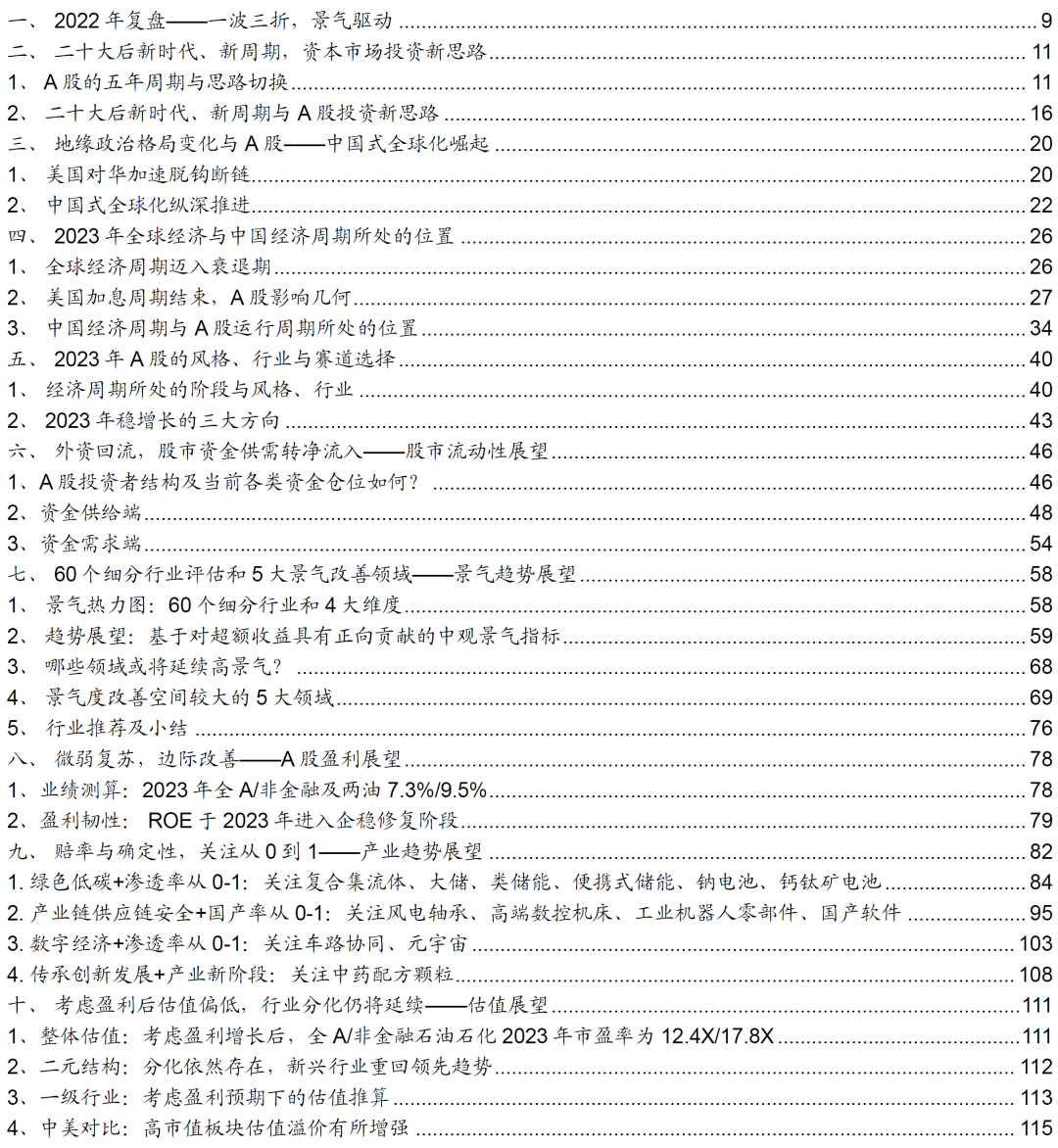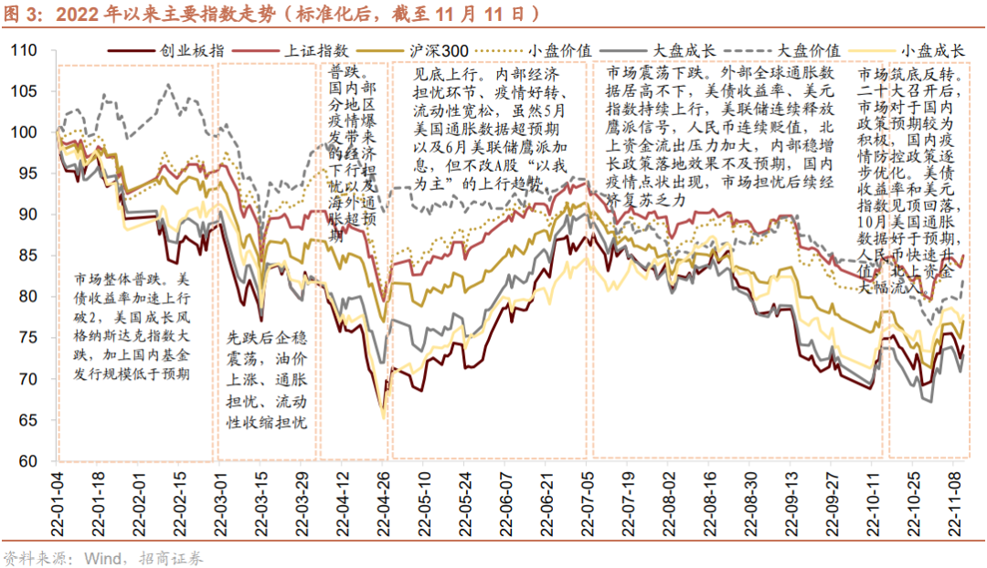 分阶段来看,2022年以来的市场行情分为以下六个阶段演绎:第一阶段为年初至俄乌危机爆发前(年初至2月下旬),市场整体普跌。主要驱动因素在于,美债收益率加速上行破2,美国成长风格纳斯达克指数大跌,加上国内基金发行规模低于预期,尽管有央行降息,但是无法扭转风险偏好陡然降低,直接开启下跌,热门赛道热门板块全面杀跌,稳增长预期和低估值相对抗跌。第二阶段为2月下旬至部分地区疫情开始爆发的3月底。市场走势为先跌后企稳震荡,主要驱动因素为油价上涨、通胀担忧、流动性收缩担忧:俄乌危机等地缘政治事件等造成能源价格暴涨,滞胀等担忧对市场风险偏好构成冲击,三月上旬中概股继续暴跌,政策担忧、中美脱钩叠加滞胀担忧等,带来了绝对收益型资金负反馈;三月下半月开始随着金稳会的召开,市场信心有所恢复;基建、房地产成为了阻力最小的方向。第三阶段为3月底至4月底,市场走势为普跌。主要驱动因素为国内部分地区疫情爆发带来的经济下行担忧以及海外通胀超预期:投资者普遍担忧部分地区疫情对经济带来负面影响,延迟经济见底和复苏的进程,海外通胀超预期,美联储激进收缩政策,美股连续下跌,4月中旬开始,人民币汇率快速贬值,4月贬值幅度超4%,对股票市场构成压力;消费和价值风格受益于经济稳增长预期,相对占优。第四阶段为4月底6月底,市场整体见底上行。主要驱动因素为内部经济担忧缓解、疫情好转、流动性宽松,外部美债美元指数见顶回落,通胀预期边际好转:5月开始前期疫情较为严重的部分区域疫情大幅好转;5月20日LPR调降,流动性宽裕;6方面33条稳经济一揽子政策措施出台、全国稳经济会议召开、中央要求地方稳经济政策应出尽出;5月美联储议息会议纪要显示通胀预期可能见顶,5月下旬美股明显反弹,虽然6月公布的5月美国通胀数据超预期以及6月美联储鹰派加息,但不改A股“以我为主”(流动性充裕、复苏预期和部分领域的产业趋势)的上行趋势。第五阶段为7月初至二十大召开(10月16日)前,市场震荡下跌。主要驱动因素为,外部全球通胀数据居高不下,美债收益率、美元指数持续上行,美联储连续释放鹰派信号,美债收益率从7月初的3%以内持续上行至10月中旬的4.5%以上(1、2年期)和4%以上(10年期),人民币连续贬值, 期间贬值幅度超过7%,北上资金流出压力加大,内部稳增长政策落地效果不及预期,中长期贷款增速走弱,国内疫情点状出现,市场担忧后续经济复苏乏力,叠加外需逐步走弱预期,市场震荡下跌,跌幅明显。第六阶段为二十大召开(10月16日)至今,市场筑底反转。主要驱动因素为,内部随着二十大的胜利召开,市场对于国内政策预期较为积极,稳健货币政策开始更有力度,稳增长政策加码预期进一步加大,国内疫情防控政策逐步优化,经济回暖的预期更加积极,产业政策层面催化较多。外部美联储官员开始出现鸽派声音,11月加息靴子落地后,美债收益率和美元指数见顶回落,人民币兑美元贬值压力减轻,外资净流出告一段落,随着10月美国通胀数据好于预期,市场对于通胀筑顶和加息放缓的预期进一步加强,人民币也快速升值,北上资金大幅净流入,市场情绪明显活跃。二十大在十月份胜利召开,意味着中国经济建设和发展进入了新的阶段;在顺利实现小康社会的目标后,自2023年开始,中国正式进入了建设中国式现代化的新阶段。