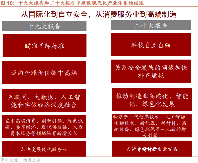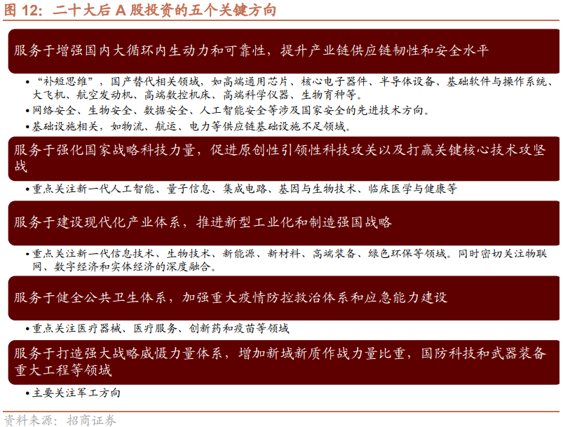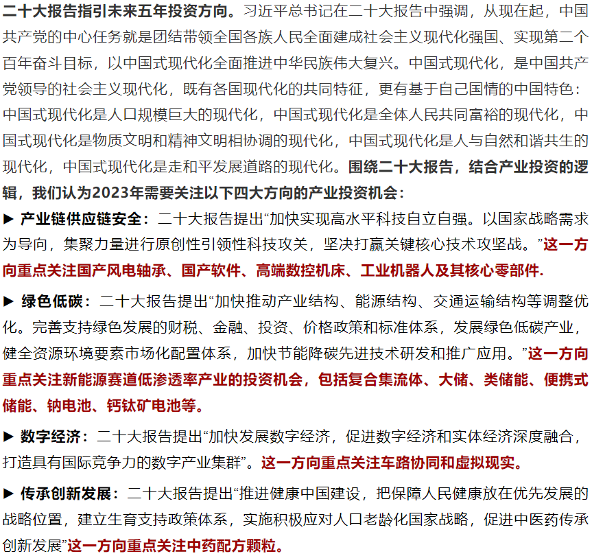 在投资者终于熟悉了“成长龙头”战法,但是市场投资主旋律再度发生变化,2021年信用环境的紧缩,以及政策对于专精特新开始大力支持,原本依靠流动性不断支撑估值的大盘成长开始估值崩塌,小盘风格有点崛起的征兆。不过2022年前三季度,随着市场大幅调整,所有风格一起调整,各种风格似乎又来到了新的同一起跑线。2017~2021年外资和公募主导定价大盘龙头风格;随着二十大顺利召开,未来五年核心思路又将会发生怎样的变化,我相信答案也隐藏在二十大报告中。十六大和十八大两次重要的党的代表大会召开完后,市场都进入了结构性行情,在经历了2001~2002年,2011~2012年的深度调整后,2002年底和2012年底之后的两年左右,市场都上演了经典的“五朵金花”行情。2002年十六大胜利召开后,中国迎来了城镇化工业化最快的十年,这十年的成长方向为煤炭、钢铁、电力、银行和汽车等周期板块,2003-2004年表现较好,被称为“五朵金花行情”。2012年十八大胜利召开后,中国迎来了经济结构转型和寻找新增长点的十年,而在十八大报告中,就明确“建设下一代信息基础设施,发展现代信息技术产业体系,健全信息安全保障体系,推进信息网络技术广泛运用”,因此2013~2014年,计算机、传媒、互联网、通信、电子成为“新五朵金花”。2022年二十大胜利开召开,新时代进入新阶段,又来到了“逢三逢四结构牛”,那么新时代五朵金花又会如何演绎。我们仍然在二十大报告中寻找答案。在二十大报告描述经济的最重要的两部分内容,第一部分内容描述构建高水平社会主义市场经济体制,相比十九大报告,对于民营企业的保护更加强调,明确强调支持中小微企业发展。未来对于中小民企的政策环境有望进一步改善。而另外一方面,继续强调加强反垄断和反不正当竞争,依法规范和引导资本健康发展。报告中写道:“坚持和完善社会主义基本经济制度,毫不动摇巩固和发展公有制经济,毫不动摇鼓励、支持、引导非公有制经济发展,充分发挥市场在资源配置中的决定性作用,更好发挥政府作用。深化国资国企改革,加快国有经济布局优化和结构调整,推动国有资本和国有企业做强做优做大,提升企业核心竞争力。优化民营企业发展环境,依法保护民营企业产权和企业家权益,促进民营经济发展壮大。完善中国特色现代企业制度,弘扬企业家精神,加快建设世界一流企业。支持中小微企业发展。深化简政放权、放管结合、优化服务改革。构建全国统一大市场,深化要素市场化改革,建设高标准市场体系。完善产权保护、市场准入、公平竞争、社会信用等市场经济基础制度,优化营商环境。健全宏观经济治理体系,发挥国家发展规划的战略导向作用,加强财政政策和货币政策协调配合,着力扩大内需,增强消费对经济发展的基础性作用和投资对优化供给结构的关键作用。健全现代预算制度,优化税制结构,完善财政转移支付体系。深化金融体制改革,建设现代中央银行制度,加强和完善现代金融监管,强化金融稳定保障体系,依法将各类金融活动全部纳入监管,守住不发生系统性风险底线。健全资本市场功能,提高直接融资比重。加强反垄断和反不正当竞争,破除地方保护和行政性垄断,依法规范和引导资本健康发展。”以上所描述的环境,在未来对于中小民企,尤其是在创新领域的民企,将会有一个更好的发展环境。比较2017年十九大报告中,重点强调了互联网、大数据、人工智能和实体经济深度融合,提到共享经济为经济的新动能,对应的2018~2020年港股互联网, A股大数据和人工智能指数显著战胜了指数。应该说十九大召开之后的2018~2020年,偏“软”的应用领域迎来一波较大的发展。另外一方面,中高端消费成为写在经济新增长点和新动能的首提方向,2018~2020年,在中高端白酒、免税、医疗服务、教育涌现出一批十倍股,成为资本市场最活跃的投资领域。相比之下,二十大的报告在同样位置强调的内容会有明显差异。仍然是强调制造强国,但是表述有了明显变化:第一,从“瞄准国际标准”到“科技自立自强”,在2018年发生的一系列美国针对中国脱钩断链的打压措施之后,更重要的是科技自立自强;第二,从“迈向全球价值链”中高端到“在关系安全发展的领域加快补齐短板”,安全发展成为二十大之后重要的投资主线;第三,从“互联网大数据人工智能和实体经济深度融合”,到“推动制造业高端化、智能化、绿色化”;第四,从中高端消费等,到“构建新一代信息技术、人工智能、生物技术、新能源、新材料、高端装备、绿色环保等一批新的增长引擎”。从软科技到硬科技,成为未来投资转变的重要方向。如果说十九大之后是中高端消费、消费升级的天下,那么二十大之后很可能是高端制造、制造升级的天下。从高端消费、消费升级转变为高端制造、制造升级;第五,支持专精特新企业发展,与第一部分的支持中小微企业发展,一起构成了未来将会大力鼓励扶持中小专精特新企业的政策信号。从龙头为王,到专精特新。围绕二十大报告,我们可以总结二十大之后投资的五个关键词:科技自立自强、安全发展,高端制造、硬科技、专精特新。