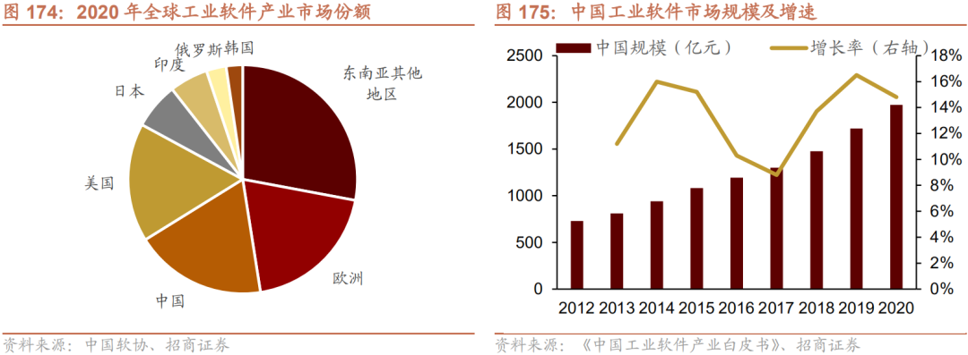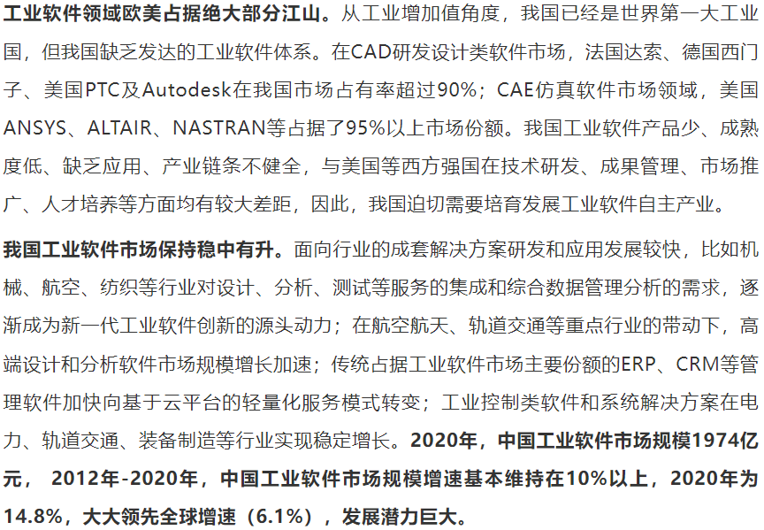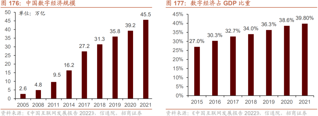 基础软件美国一家独大。2020年,在全球操作系统、基础软件(含桌面、数据库、云操作系统、工具软件等)领域,美国业务收入0.81万亿美元,占全球该领域业务收入的五分之四。全球桌面操作系统市场中,微软的Windows操作系统占据高达88.14%的市场份额,继续垄断全球PC操作系统。移动操作系统市场中,谷歌的Android市场占有率为75.44%,远高于其他操作系统;位居第二名的是苹果的iOS,市场占率为22.49%。我国基础软件份额较少,国产基础软件的国内市场份额仅为5%,国产操作系统的国内市场占有率仅为4%。近几年相当多的国产基础软件开始进入公众视野。老牌公司如麒麟软件、统信软件,以及华为推出的欧拉(openEuler)、鸿蒙等,可以看见,国产基础软件,尤其是最薄弱的操作系统,在国内已经有所突破。工业软件是工业技术、知识和流程的程序化封装与复用。工业软件能够定义工业产品、控制生产设备、优化制造和管理流程、变革生产方式、提升全要素生产率。传统的流程优化循环由三个部分组成:执行部门、研发部门、管理部门。管理部门在生产过程中收集运作数据、发现问题、总结规律,并反馈给研发部门;研发部门改进工艺、优化流程、搭建新的生产模型;执行部门应用新模型、产生新的数据和问题。工业软件则是在此循环的基础上,加入电子信息技术的产物,通过机器学习等信息技术手段,将工艺流程、生产规律这些原本只由人类掌握的技术转化为算法,再将各种算法打包成一个业软件,帮助人类优化工业的各个环节。工业软件按照产品生命周期的阶段或环节,可以大致划分为研发设计类软件、生产制造类软件、运维服务类软件和经营管理类软件。3. 数字经济+渗透率从0-1:关注车路协同、元宇宙数字经济是新一轮科技革命和产业变革新机遇的战略选择。二十大报告提出要加快发展数字经济,促进数字经济和实体经济深度融合,打造具有国际竞争力的数字产业集群,优化基础设施布局、结构、功能和系统集成,构建现代化基础设施体系。2022年第2期《求是》杂志刊发习近平总书记重要文章《不断做强做优做大我国数字经济》强调,综合判断,发展数字经济意义重大,是把握新一轮科技革命和产业变革新机遇的战略选择。2022年1月12日,国务院印发《“十四五”数字经济发展规划》,提出到2025年,数字经济迈向全面扩展期,数字经济核心产业增加值占GDP比重从2020年的7.8%提升至10%,数字化创新引领发展能力大幅提升,智能化水平明显增强,数字技术与实体经济融合取得显著成效,数字经济治理体系更加完善,我国数字经济竞争力和影响力稳步提升。中国数字经济规模稳定增长,在国民经济中的地位愈发突出。2021年中国数字经济规模达到45.5 万亿元,较2019年增加6.3 万亿元,2005到2021年期间,数字经济规模从2.6 万亿元增长到45.5 万亿元, CAGR达到19.8%;2020年数字经济占GDP比重为39.8%, 2005年到2021年期间,数字经济占GDP比重由14.2%提升至39.8%。数字经济方向需要重点关注当下政策重点扶持的车路协同和元宇宙两大产业趋势。