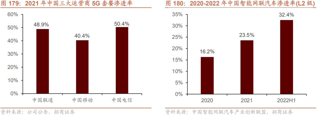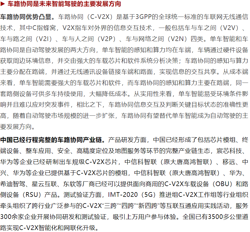 车路协同进入高速发展期。2018 年 11 月,工信部率先在全球发布车联网频率规划,将 5905-5925MHz 分配给 LTE-V2X 使用,通信院于同年完成了基于 LTE-V2X 的车联网商用规模性试验,并于 2019 年进行了预商用测试, 2020年实现了正式商用。与此同时,5G 规模化商用也在逐步推进,2019 年进行 5GNRUu 技术试验,2020 年进行5GNRPC5 技术试验, 2021 年进行预商用测试, 2022 年正式迈入 5GNR-V2X 商用元年。根据《C-V2X产业化路径和时间表研究白皮书》给出的时间表,C-V2X在2020-2021 年仍然处于导入期,在 2022 年之后会进入发展期,到2025年国内C-V2X车载终端的前装渗透率将达到50 %;路侧设施规划至2025年实现在典型城市和高速公路覆盖范围的扩大。据5GAA规划, 2024年基于R16版本的5G-V2X技术应用可基本实现。5G和智能网联汽车的高渗透率是车路协同发展的基础。车路协同需借助5G技术的超低延时、超高可靠与超高速率实现一定区域、一定条件下车与数字化万物的互联互通,截至2021年底,中国已建成142.5万个5G基站,总量占全球60%以上。车路协同系统的车端是智能智能网联汽车,近年来,中国智能网联汽车的销量和渗透率不断升高,2021年中国乘用车市场中L2级车辆渗透率为23.5%,2022上半年,2022年上半年L2级乘用车上险数量达288.09万辆,同比增长46.2%,L2级车辆渗透率增长8.9个百分点,达32.4%。
