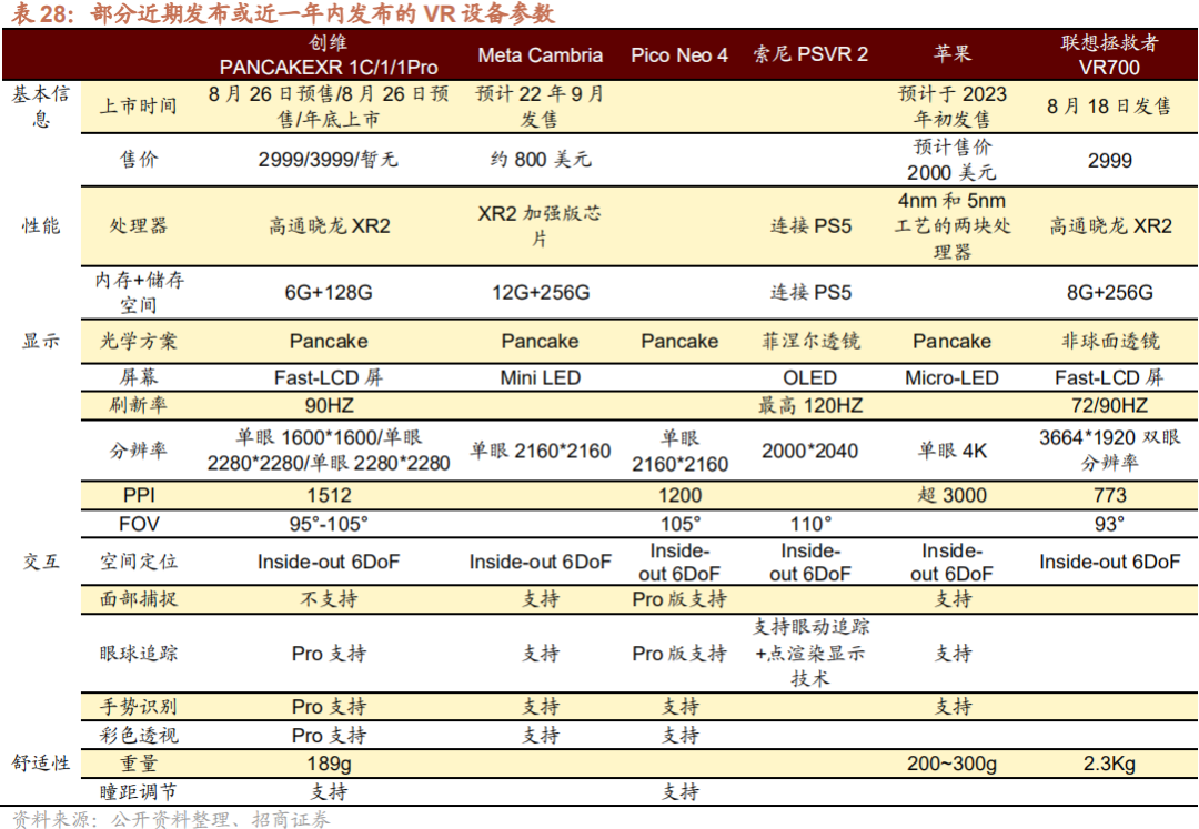 地方政策聚焦技术研发突破和产业融合应用,全方位构建元宇宙生态发展体系。据链上产业区块链研究院不完全统计,截至2022年9月底,全国各省市区发布的与元宇宙相关的政策有32项。其中,元宇宙专项政策有15项,占比近一半。政策内容主要聚焦于产业融合应用、核心技术研发和优化产业布局等方面。其中,省级政策占比31%,地市级占比47%,区县级占比22%,由此可见,多个地方的政府部门已经意识到了元宇宙在新的技术革新和产业变革中的重要作用,积极打造元宇宙应用示范区,促进元宇宙产业集群化发展。VR设备是元宇宙从概念走向商业化落地的关键入口。VR设备是元宇宙硬件设备的基础设施,2021年以来VR设备销售火热,VR头戴式显示器的全球出货量达1095万台,突破年出货1000万台的行业拐点,今年一季度,VR头显保持热销,全球出货量同比增长了241.6%。而在国内,VR行业的热度也正在逐渐提升。数据显示,2022年上半年,中国VR市场零售额突破8亿元,同比增长81%,头戴式显示器销售均价由早期的千元以下拉升至1740元左右。多项VR新品相继发布。据统计,2022年VR新品包括:PICO4、MetaQuest 2 Pro、索尼PSVR 2;2023年新品包括:MetaQuest 3、苹果第一代头显等。随着相关新品在重量、舒适度方面的不断改进,体现了VR底层硬件技术的升级优化。1)光学:最新推出的VR设备普遍采用Pancake方案,能够利用光的偏振特性,通过半透半反膜、反射偏振片等使光在光学模组中反射多次,达到“折叠”光学路径的目的,从而大幅降低VR头显重量及尺寸,提升用户的佩戴体验。2)显示:从开始的Fast-LCD向Micro-OLED技术和Mini-OLED技术升级。Micro-OLED技术能够提升VR设备的显示性能,Mini-OLED技术则有利于解决眩晕和沉浸感不足的问题。3)交互技术:空间定位、手部追踪、面部追踪、眼球追踪等技术不断成熟,正快速导入应用,大大提升了用户使用时的交互感。