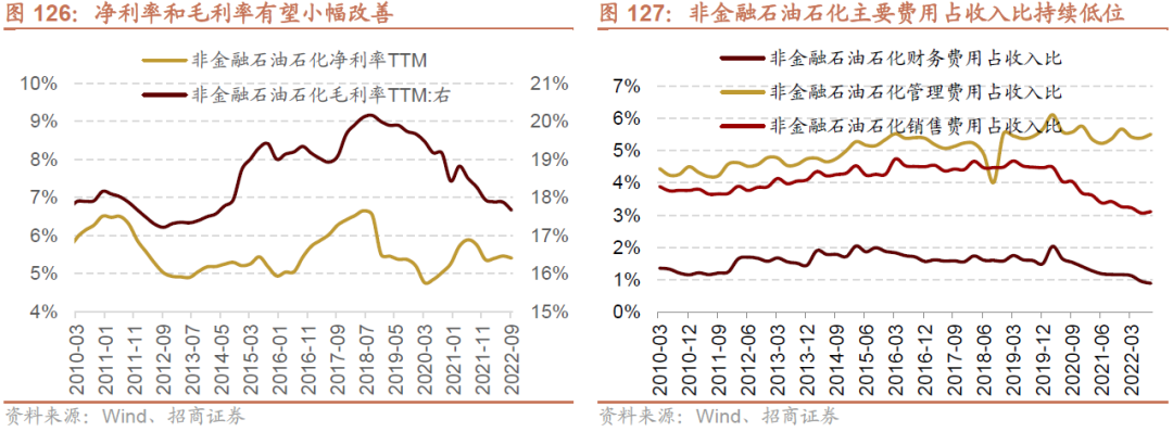 21年下半年以来上游资源品价格持续处于较高水平导致非金融石油石化板块毛利率不断下降,而企业管理和销售费用一直处于相对可控水平,当前财务费用、销售费用等占收入的比重明显低于疫情前,一定程度上抵消了资源品上涨带来的成本压力,因此企业净利率保持相对稳健。预计22年四季度及2023年销售净利率将迎来改善。一方面,部分原材料价格已进入下行通道,预计未来大宗商品还将继续回落,成本端压力进一步缓解;另一方面,疫情之后,减税降费力度逐渐加大,短期企业仍可享受费用红利,使得销售净利率小幅提振,进而对ROE带来正向驱动。总体来看, 2022四季度至2023年,非金融及两油ROE整体预计进入触底小幅修复阶段。从历史数据来看,ROE的拐点一般滞后于净利润的拐点1-3个季度,根据此前的分析, 22年二、三季度基本是本轮盈利的底部,相应的四季度或23年年初将会看到ROE底部复苏,23年保持弱复苏的态势。从基本面来看,销售净利率的改善预计是ROE改善的主要驱动因素。成本下降为毛利率提供上行空间,费用低位有利于净利率企稳改善;资产周转率在收入增速放缓和总资产逐渐提升的双重作用下预计上行空间有限;企业扩张意愿略有提升,杠杆率预计窄幅波动。
