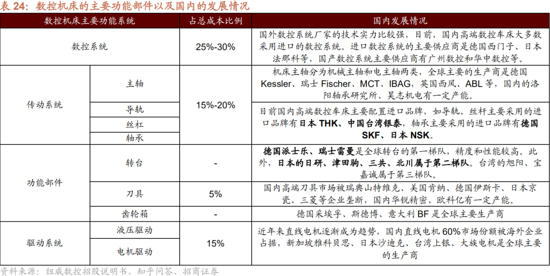 我国高端数控机床的上游各功能部件尚未形成较好的产业配套,多数功能部件被日本、德国、美国的公司垄断,国内企业主要依赖外购。数控机床的核心部件包括数控系统、传动系统、功能部件、驱动系统等,其中,数控系统占数控机床成本的25%-30%,主要被西门子、发那科垄断;传动系统包括主轴、导轨、丝杠、轴承等,主要被德国、瑞士、日本、中国台湾的一些公司占据;功能部件包括转台、刀具、齿轮箱等,全球市场依旧由欧美日等发达国家企业占据仍然来自欧日美等发达国家。以配套或者外购以上核心部件实现车床精度和可靠性在行业竞争中无法获得显著优势,一方面技术受限于核心部件生产方,另一方面产品成本难于控制。
