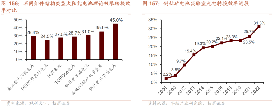 钙钛矿电池转换效率理论极限与实验室数据均高于晶硅电池。钙钛矿材料吸光系数远高于晶硅材料,光电转换性能极好,能量转换过程中能量损失极低,从理论极限来看,晶硅太阳能电池、PERC单晶硅电池、HJT电池和TOPCon电池的极限转换效率分别为29.4%、24.5%、27.5%和28.7%,相比之下,钙钛矿单层电池的理论效率极值可达31%,晶硅/钙钛矿双节叠层转换效率极值可达35%,而三节层电池理论极值可达到45%,如果在钙钛矿电池中掺杂新型材料,钙钛矿电池的转换效率甚至可以达到的50%,是目前晶硅电池的2倍左右。从实验室数据来看, 过去十多年钙钛矿电池在实验室转化效率上的进步相当于晶硅太阳能电池60 余年的进展,目前钙钛矿单层电池、晶硅/钙钛矿双节叠层电池和全钙钛矿叠层电池的实验室转换效率已经分别达到25.6%、31.3%和28%。▶ 顶层政策支持推动钙钛矿电池产业化进程提速