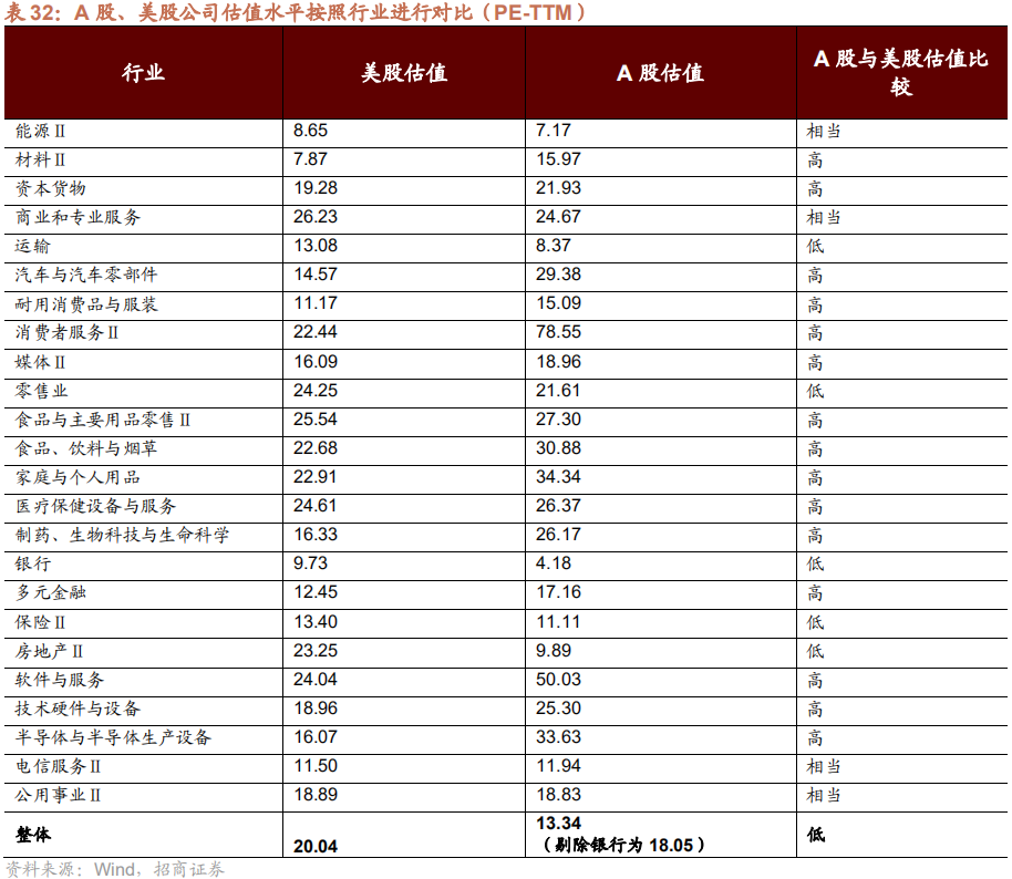 从细分行业来看,A股和美股估值相当的行业有能源、商业和专业服务、电信服务、公共事业四个行业。A股估值明显低于美股的行业依次为运输、零售业、银行、保险、房地产,主要是以传统行业为主。而A股估值明显高于美股的行业集中在消费、医药和信息科技类行业,如汽车与汽车零部件、耐用消费品与服装消费者服务、食品饮料与烟草、家庭与个人用品、医疗保健设备与服务、制药生物科技与生命科学、软件与服务、技术硬件与设备、半导体与半导体生产设备等。整体A股估值明显低于美股估值,但剔除掉银行之后A股估值则与美股相当。从市值区间来看,A股市场(剔除银行)市值1000亿元以上的公司占比为2.84%,美股市场1000亿元以上公司占比为12.10%,A股市场高市值公司占比明显低于美股市场。以市值为划分标准看,美股市场中市值处于25亿元以下的公司最多,而A股市场则是市值处于25-50亿元之间的公司占比份额最大。中美股票市场不同市值区间的估值水平存在明显差异。比较不同市值的估值水平发现,美股市场上估值和市值呈现一定的正相关关系,市值较大的公司往往能够获得更高的估值溢价;在相对健全的股市规则和机制下,美股市场上公司的进入和退出频率较高,为整个股市营造了更加健康的生态体系,即更多的资金流入经营业绩良好的企业并且形成良性循环,而基本面较差的企业越来越难以达到资金的青睐并导致估值进一步下行。而在A股市场上,市值与估值没有特别明显规律,但极小市值企业(50亿元以下)对应的整体估值水平明显偏高;不过近期极大市值公司(10000亿以上)估值则是出现提升,说明A股市场景气度较高且业绩水平较好的公司所享受到的资金青睐程度和估值溢价已经出现明显提升。