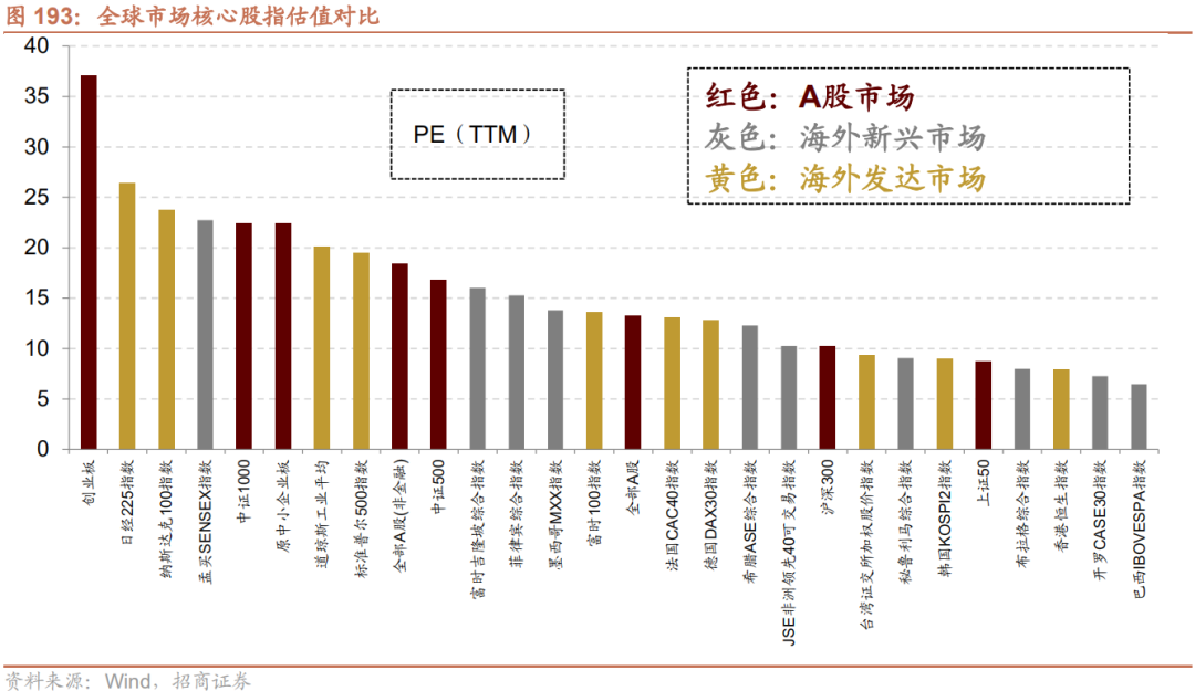 与全球股票市场核心指数估值对比,由于估值较低的金融板块占比较高,因此整体A股估值处于中等略偏低的水平,沪深300和上证50估值相对更低;剔除金融后A股估值处于中等偏高的位置,创业板指、中证1000、中小板指估值相对更高。
