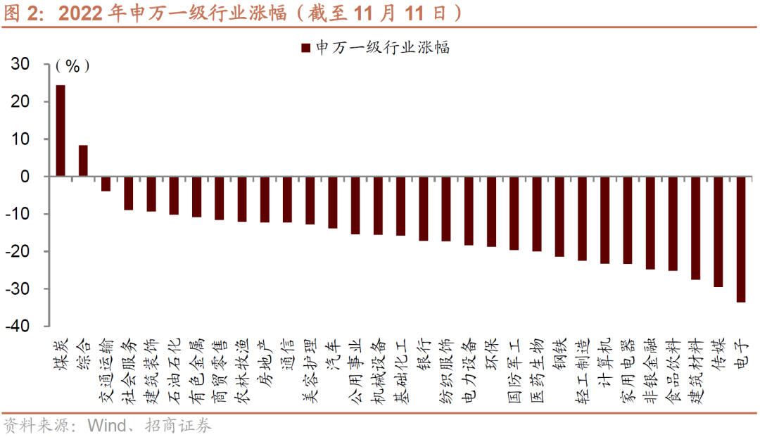 2022年A股市场波动加大,呈现出市场先跌后涨再跌、景气驱动、行业结构分化的走势。截至11月11日,A股主要指数均呈现先跌后涨再跌类似于“倒N”型走势,主要指数中小盘价值、上证指数、中证500跌幅相对较小,大盘成长、创业板指、科技龙头指数跌幅较大超过25%。整体而言,2022年A股市场风格分化特征较为明显,低估值价值指数整体跌幅相对较小,成长指数跌幅居前,但成长股内部分化巨大,主要驱动在于低估值价值(资源品价格/稳增长驱动)、成长股(高低景气分化/经济预期/海外流动性和通胀扰动)。