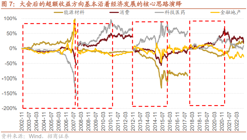 2002年十六大后:2003年指数涨幅不大,主要体现为结构牛。2012年十八大后:2013年指数整体涨幅不大,但是体现为创业板指的结构牛。每次大会报告中都会有专门一部分讨论经济建设,而每一次经济建设的重大定调和重要产业发展方向,都会对此后五年的市场走势、投资模式、行业表现、风格趋势等造成重大影响。