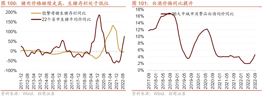 由于猪肉价格持续上行以及养殖利润改善,养殖板块景气度持续修复。当前能繁母猪存栏仍处低位,行业整体供需偏紧,预计猪价中枢仍将持续走高,四季度养殖盈利仍有较大的修复空间,盈利增速将会进一步抬升,业绩兑现确定性较强。食品类CPI也出现明显走强,预制菜需求提升为食品加工板块带来新的增长点,并且带来行业产品结构优化。白酒三季报表现较为稳健,部分次高端白酒业绩增长略有提速,多家公司全年业绩任务无忧;近期36大中城市白酒均价同比略有回暖,预计白酒板块业绩仍具备较强的韧性。