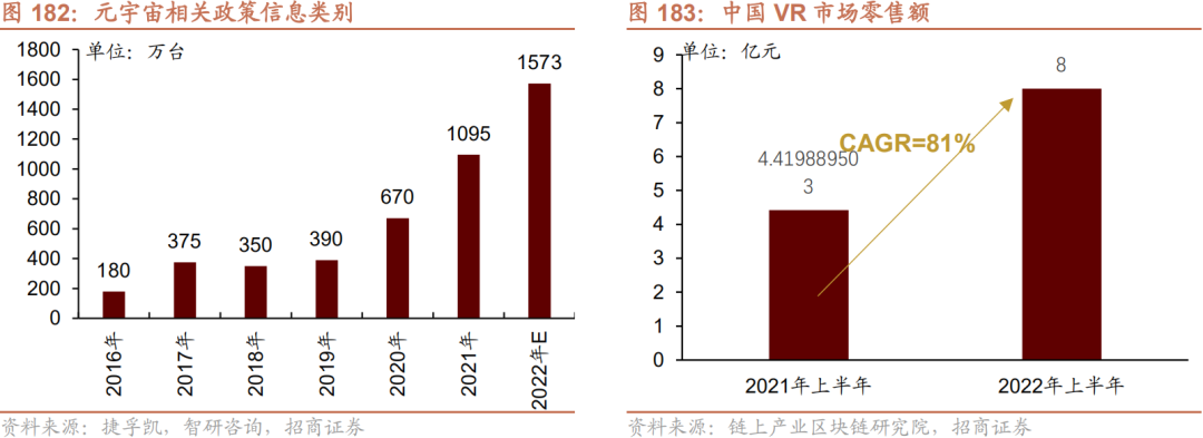 2022年以来,国家出台多项政策性文件支持元宇宙相关产业发展。2022年1月,央行印发《金融科技发展规划(2022-2025 年)》,提出以线下为基础,依托5G 高带宽、低延时特性将增强现实(AR)混合现实(MR)等视觉技术与银行场景深度融合。2022年11月,五部门联合发布《虚拟现实与行业应用融合发展行动计划(2022-2026年)》,提出至2026年,我国虚拟现实产业总体规模超3500亿元,虚拟现实终端销量超2500万台,培育100家强创新能力与行业影响力的骨干企业。《计划》还提出关键技术融合创新、全产业链条供给提升、多场景应用融合推广三大工程。另一方面,国家多次发文要求加强对元宇宙相关问题的监管。2021年12月,文旅部发布《关于加强“元宇宙”相关问题预前治理的建议》,建议本着对创新审慎包容的立场,建立跟踪研判的工作机制和预前治理的协同机制,杜绝虚拟空间出现法外之地;此外银保监会着重强调要防范以“元宇宙”相关名义进行非法集资的风险。总体而言,国家整体对元宇宙采取理性积极的政策态度,兼顾监管与发展,推动行业有序进步。