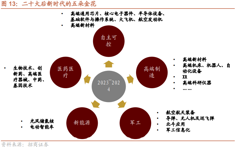 ⚑ 二十大报告指明未来五年的核心思路,A股从重视龙头(“各种茅”)、高现金流的投资思路,在经历了两年相对混乱的结构之后,有望围绕科技自立自强、安全发展,高端制造、硬科技、专精特新五个关键词构建新的选股思路。可以考虑进行重点布局报告中重点强调方向总结为高端制造、医疗医药、新能源、自主可控、军工装备(高医新自军)等新时代五朵金花。
