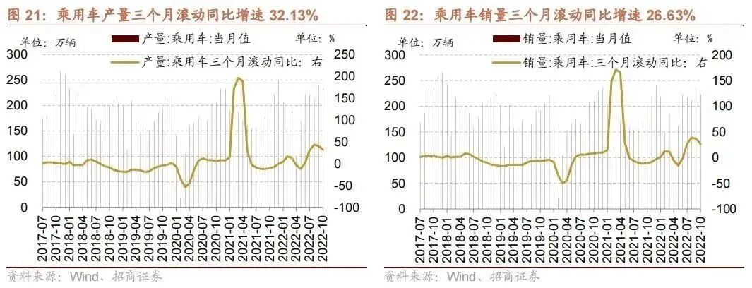 10月汽车产销分别完成259.9万辆和250.5万辆,环比分别下降2.7%和4%,同比分别增长11.1%和6.9%,产量三个月滚动同比增速收窄至25.84%,销量三个月滚动同比增速收窄至21.58%。受疫情多发散发等影响,终端市场承压,生产供给比9月略有下降。由于车辆购置税减征政策的持续发力,与上年同期相比,产销量仍保持增长势头。1—10月,汽车产销分别完成2224.2万辆和2197.5万辆,同比分别增长7.9%和4.6%,增幅较1—9月分别扩大0.5个百分点和0.3个百分点。