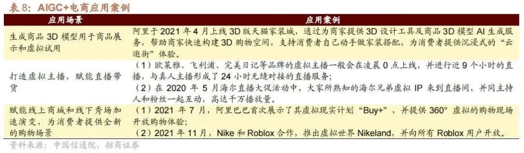 AIGC推进虚实交融,营造沉浸体验。随着数字技术的发展和应用、消费的升级和加快,购物体验沉浸化成为电商领域发展的方向。AIGC 正加速商品3D 模型、虚拟主播乃至虚拟货场的构建,通过和AR、VR 等新技术的结合,实现视听等多感官交互的沉浸式购物体验。